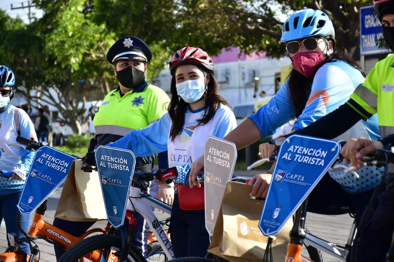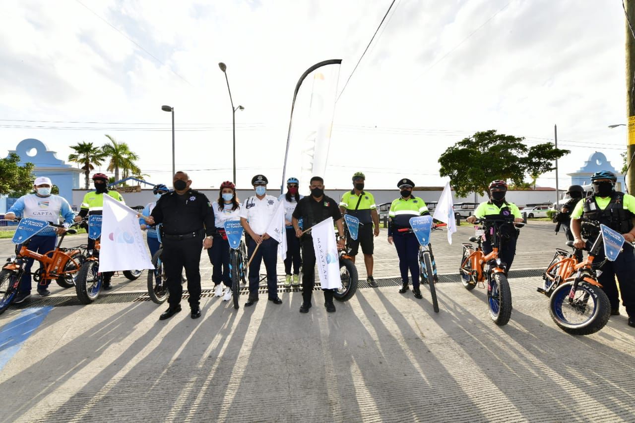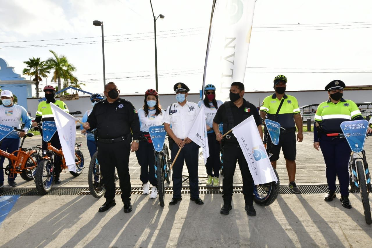 Mazatlán.- Para reforzar la proximidad y la imagen de una policía amigable hacia el turismo naviero, el Centro de Atención y Protección al Turista puso en marcha esta mañana un operativo con personal abordo de bicicletas en circuitos turísticos en la ciudad.