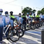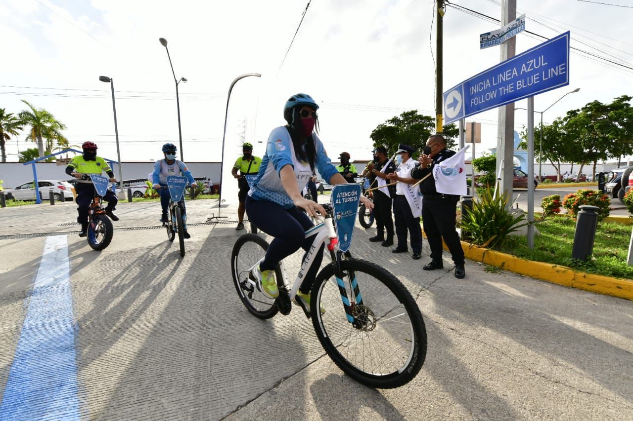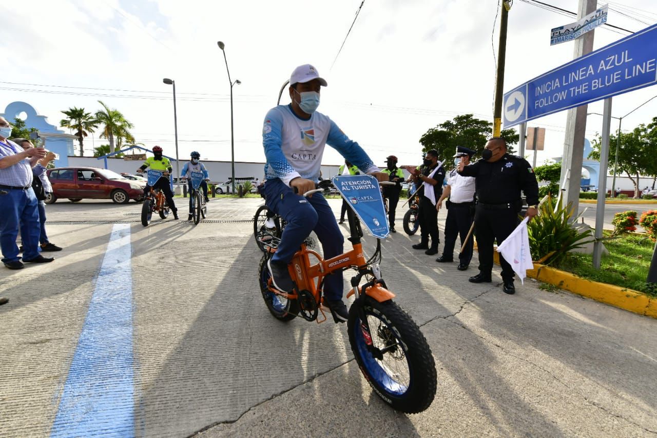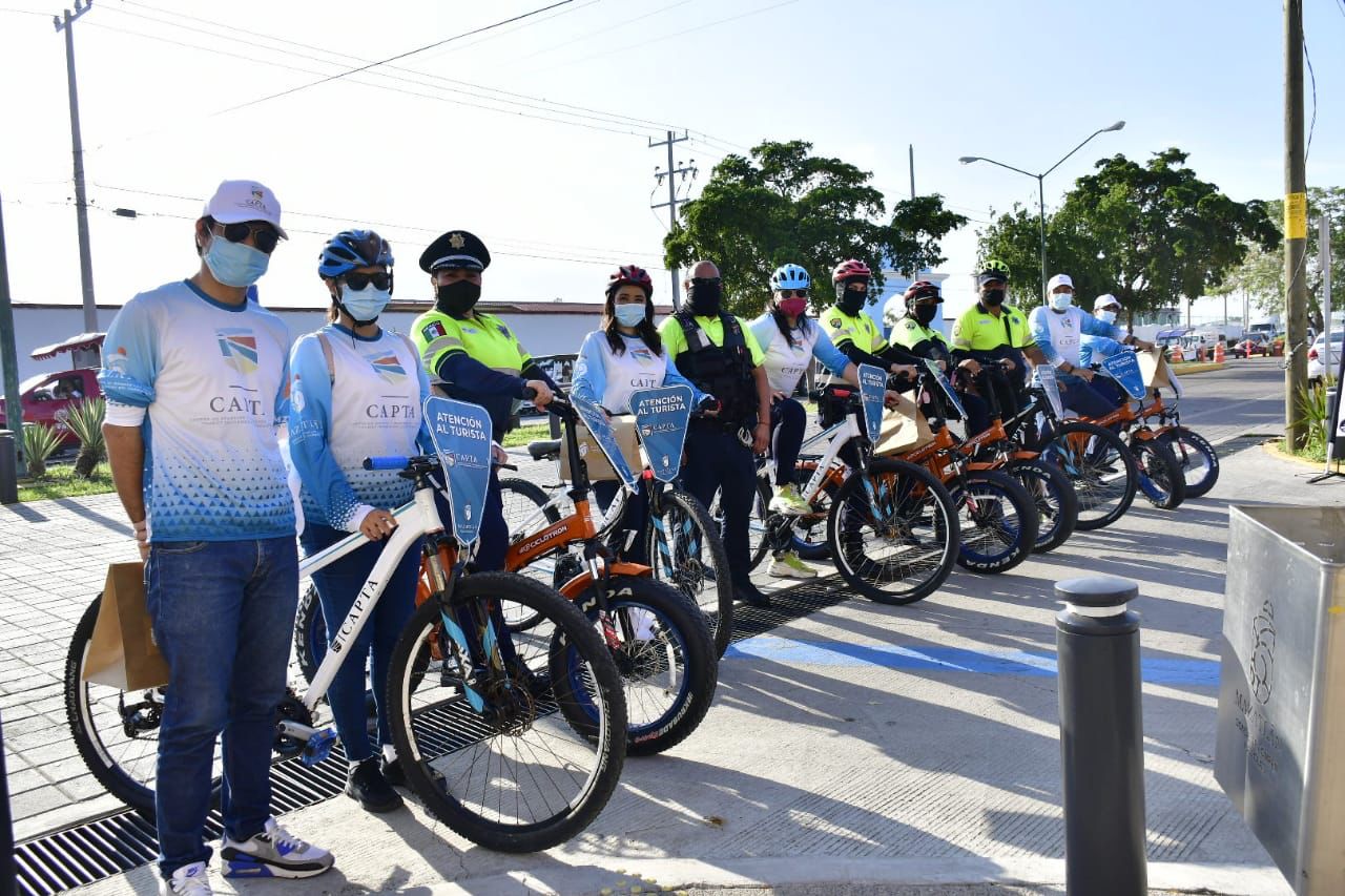 Mazatlán.- Para reforzar la proximidad y la imagen de una policía amigable hacia el turismo naviero, el Centro de Atención y Protección al Turista puso en marcha esta mañana un operativo con personal abordo de bicicletas en circuitos turísticos en la ciudad.