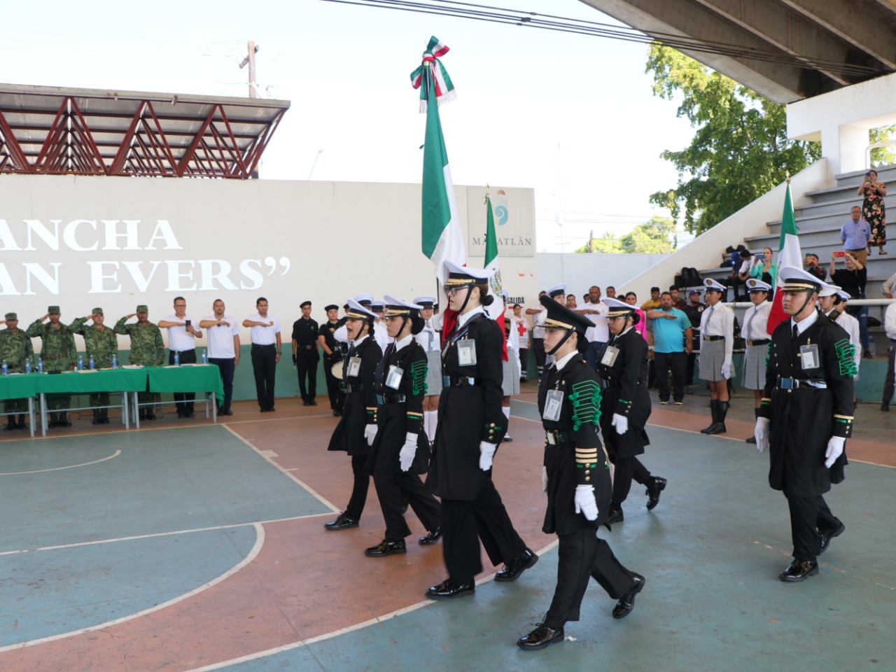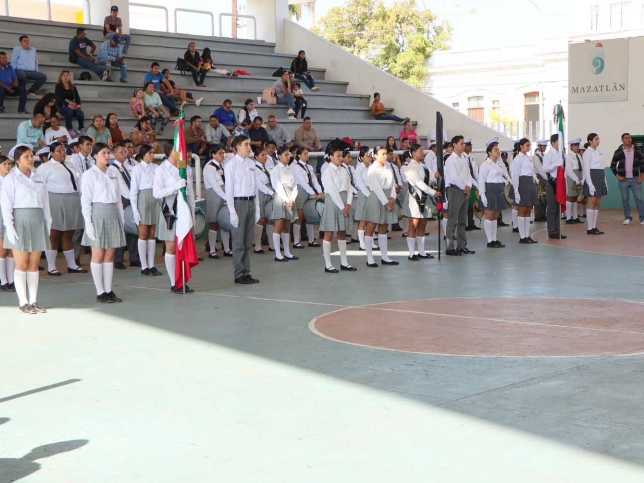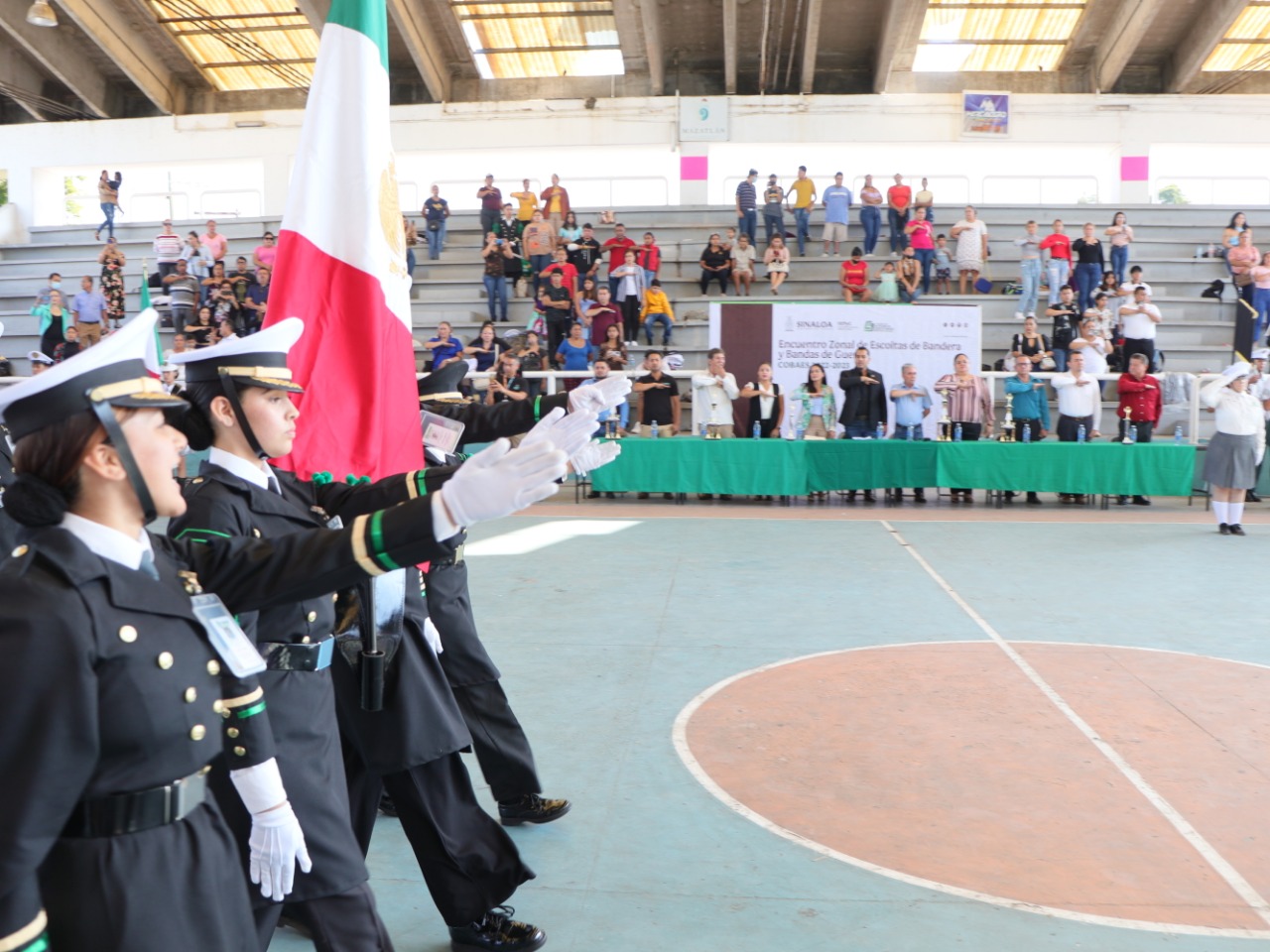 Mazatlán, Sinaloa, 7 de diciembre de 2022.- El Gobierno de Mazatlán impulsa los valores cívicos en estudiantes del Cobaes, por eso estuvo presente en el encuentro de zona 05 entre escoltas y bandas de guerra, llevado a cabo en la cancha German Evers la mañana de este miércoles.