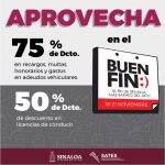 Culiacán, Sinaloa, a 10 de noviembre de 2022.- Por instrucciones del gobernador Rubén Rocha Moya, la Secretaría de Administración y Finanzas dio a conocer que durante el Buen Fin, a desarrollarse del 18 al 21 de noviembre, se ofrecerán descuentos del 75 por ciento en recargos, multas, honorarios y gastos en todos los trámites vehiculares.