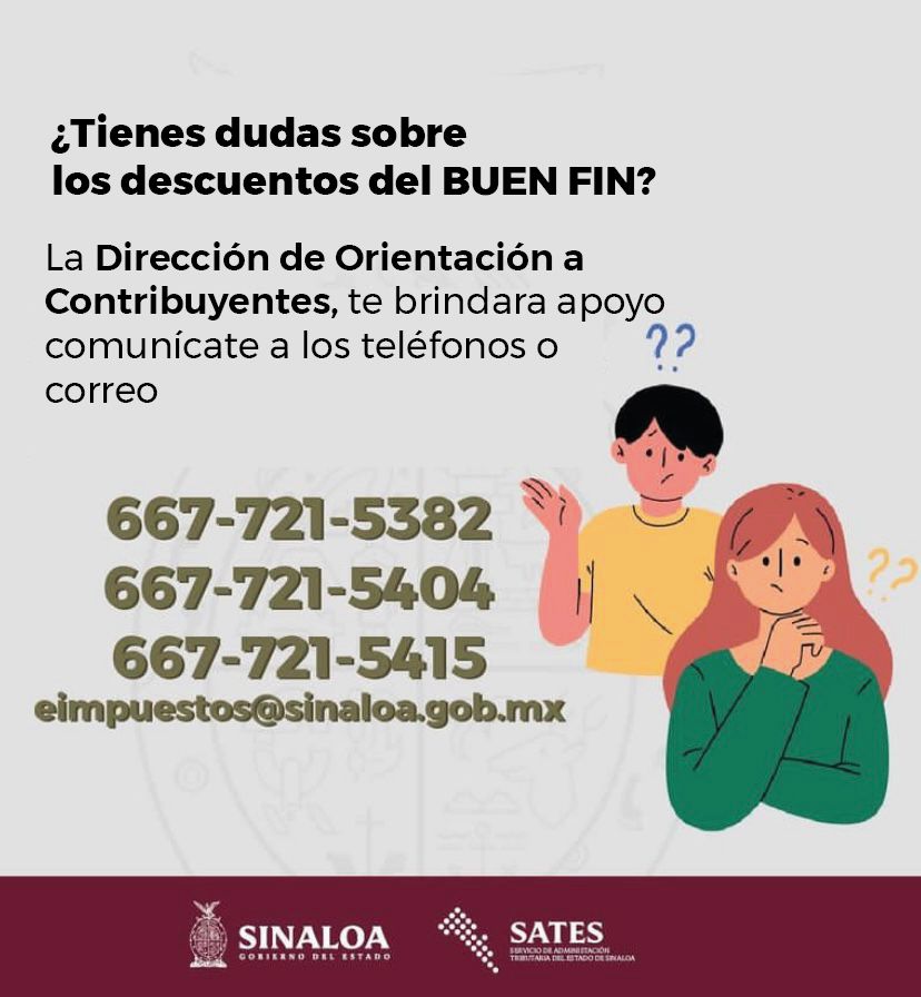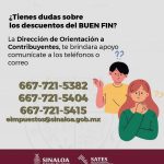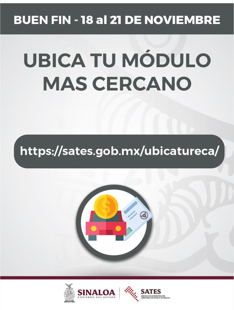 Para ubicar el módulo más cercano del lugar donde te encuentras, ingresa al portal https://sates.gob.mx/ubicatureca/, también puedes comunicarte a la Dirección de Orientación a Contribuyentes para aclarar las dudas de los descuentos del buen fin a los teléfonos 6677215382, 6677215404 y 6677215415 o al correo eimpuestos@sinaloa.gob.mx