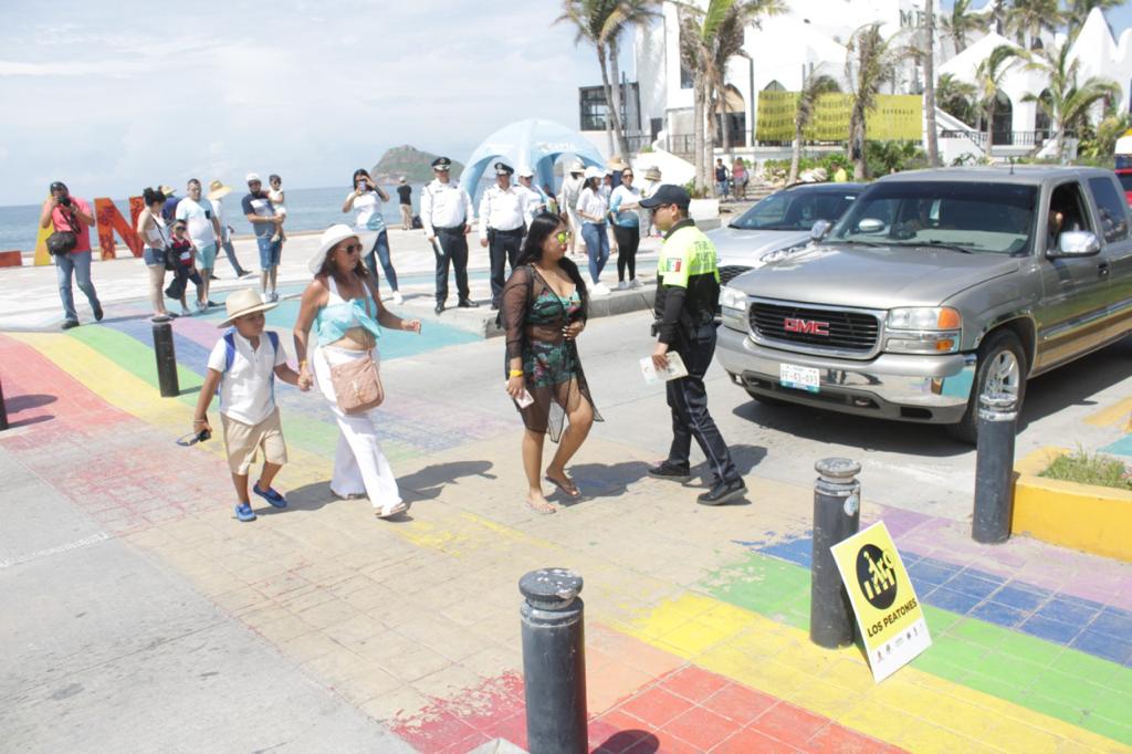 Mazatlán, SIN.- Como parte de la campaña de concientización, “Camina seguro”, esta mañana el Gobierno Municipal, a través de la Secretaría de Seguridad Pública, Tránsito y Capta, entregaron trípticos informativos a peatones, turistas y conductores que circulaban por la avenida del Mar.