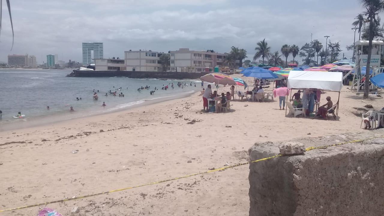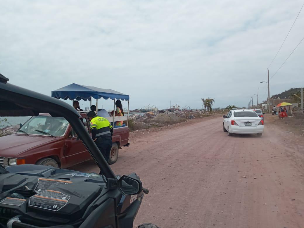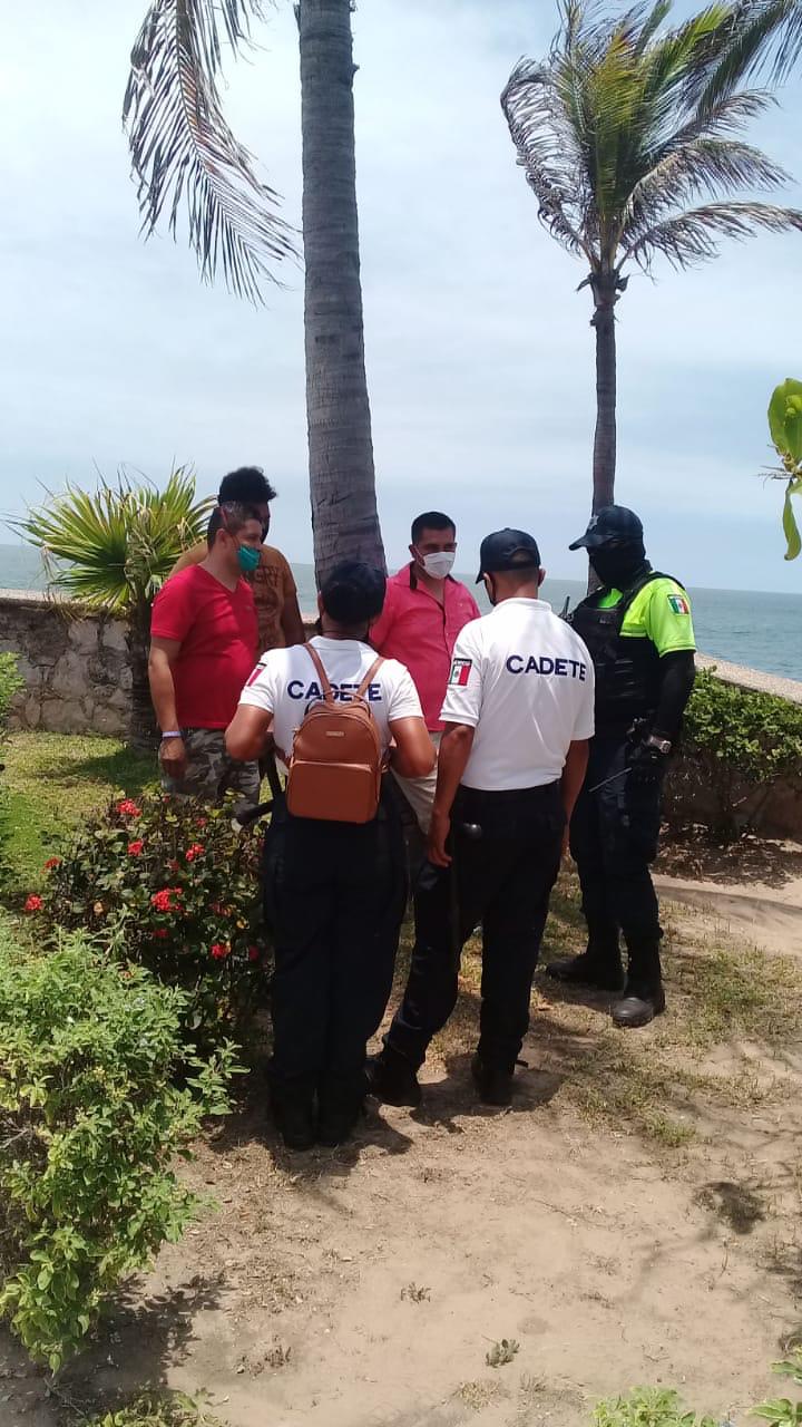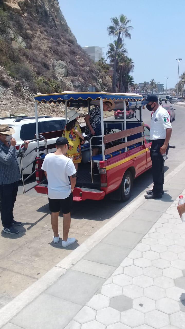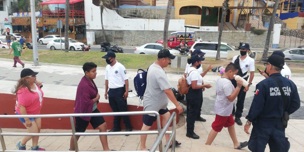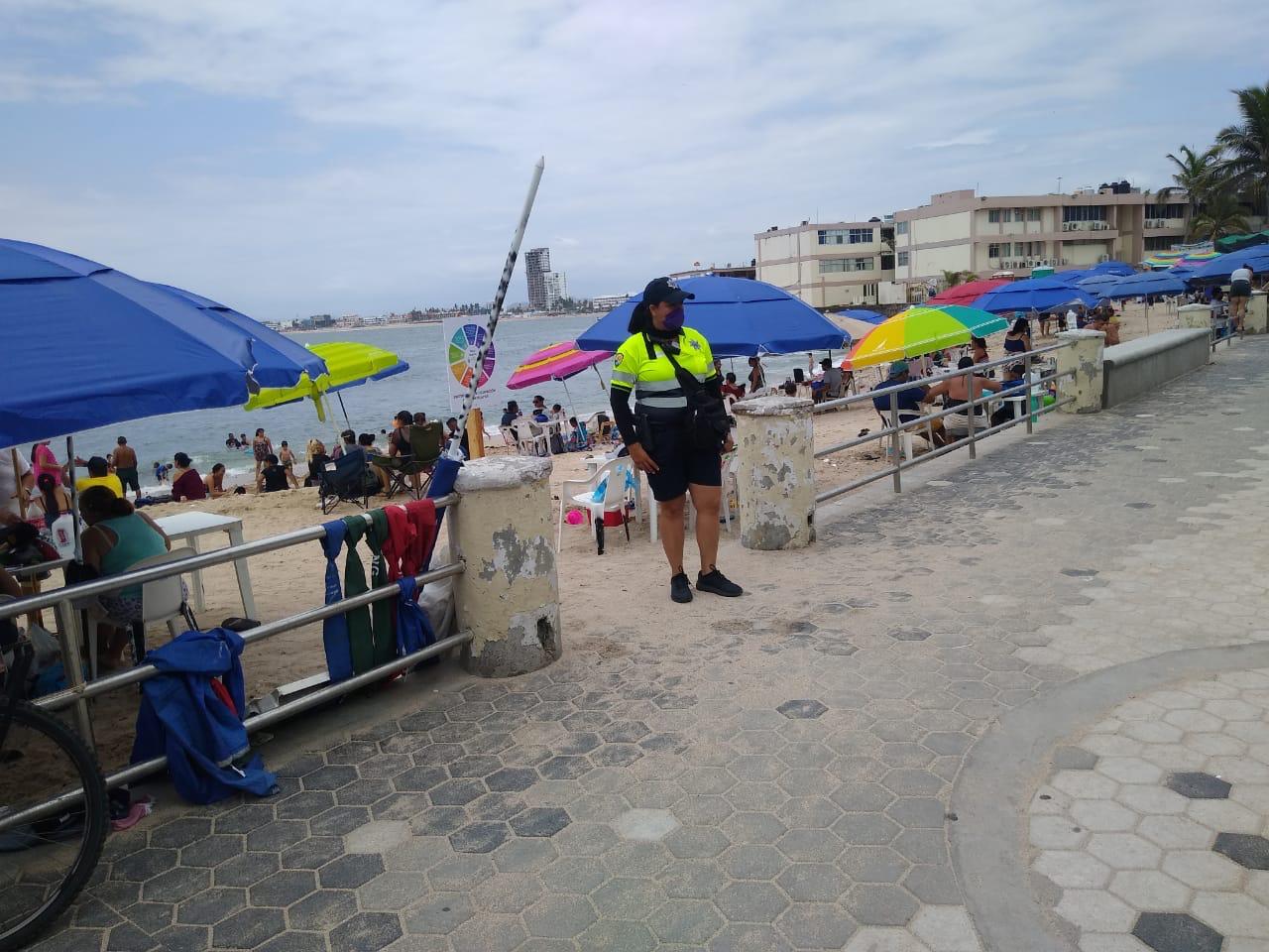 Agentes de Seguridad Pública continúan con el recorrido y presencia en los sitios de playa, en donde además de vigilar el cumplimiento a la sana distancia, se toman medidas como el cierre momentáneo de algunas zonas que se saturan de bañistas o paseantes; los elementos de Tránsito Municipal también apoyan en los cruces peatonales.