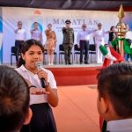 Durante la ceremonia cívica, el Presidente Municipal entregó a la Directora del plantel una bandera con su asta y material deportivo, además, los alumnos con excelencia académica recibieron un diploma y un pase para el Acuario Mazatlán.