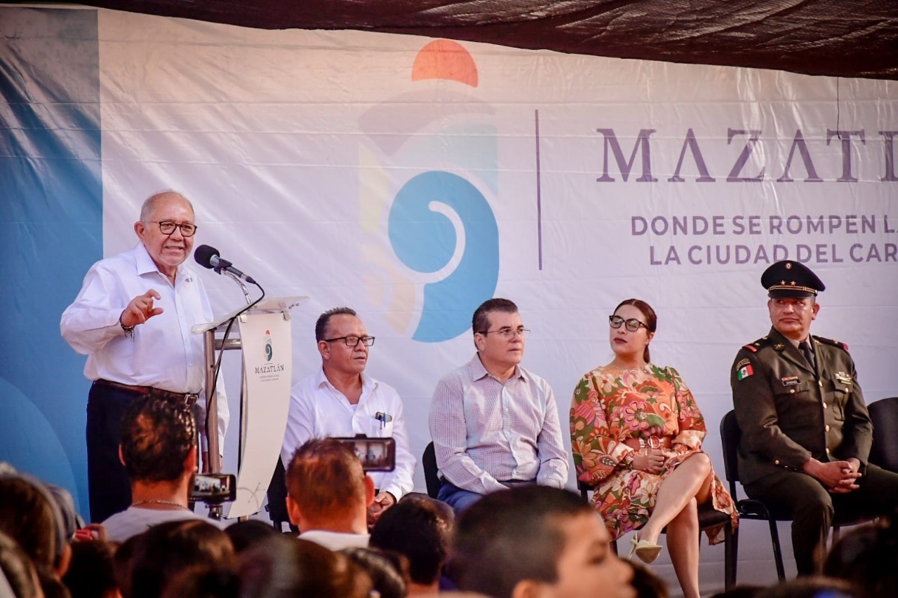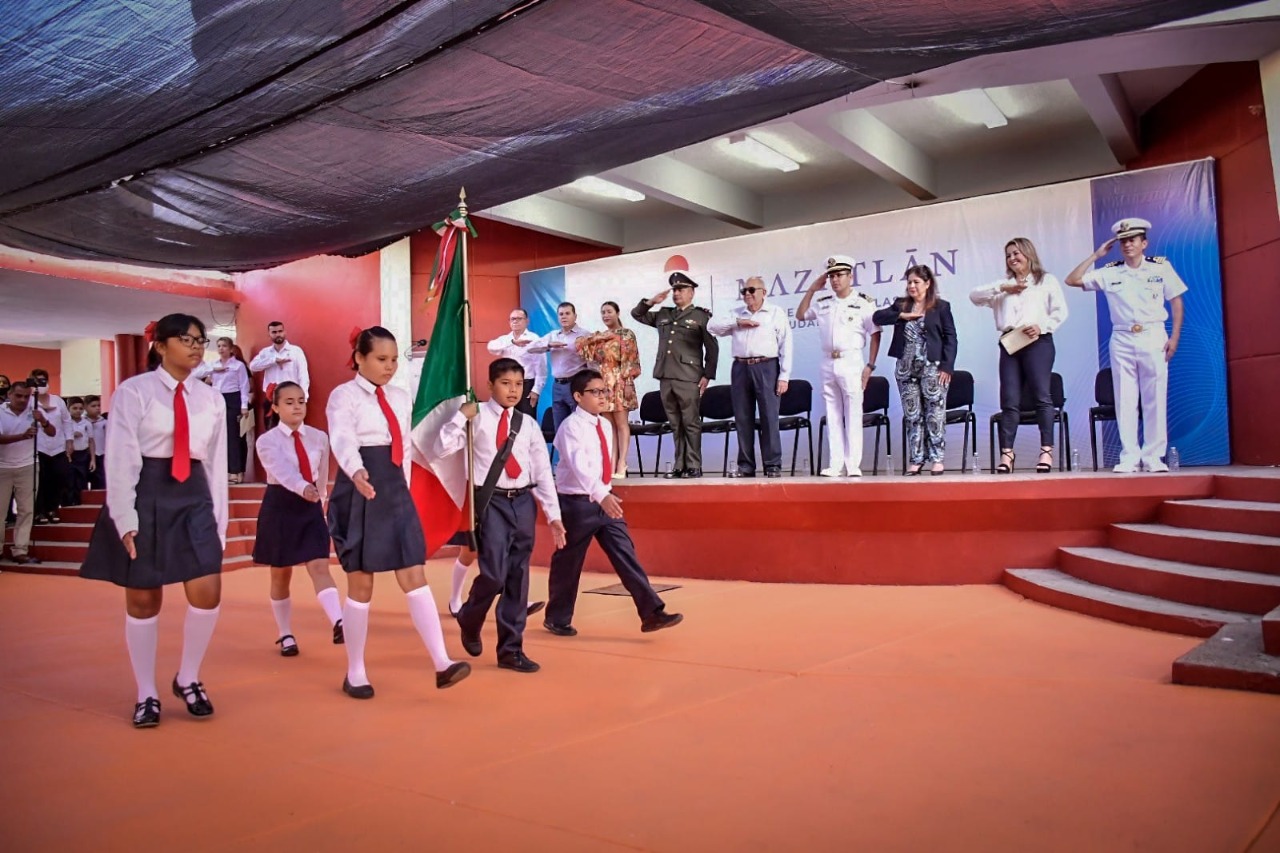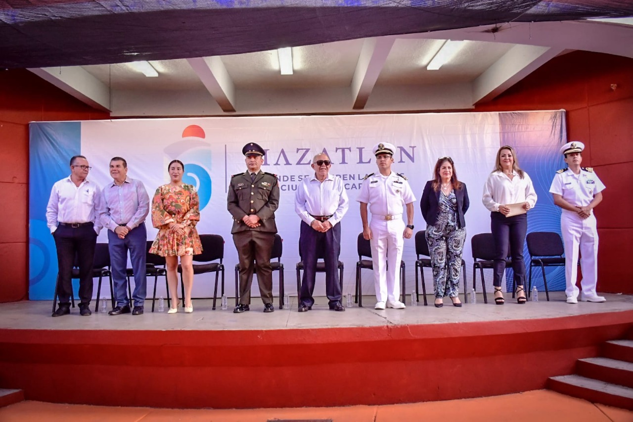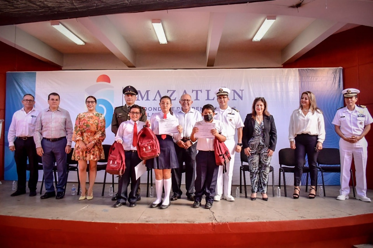 Durante la ceremonia cívica, el Presidente Municipal entregó a la Directora del plantel una bandera con su asta y material deportivo, además, los alumnos con excelencia académica recibieron un diploma y un pase para el Acuario Mazatlán.