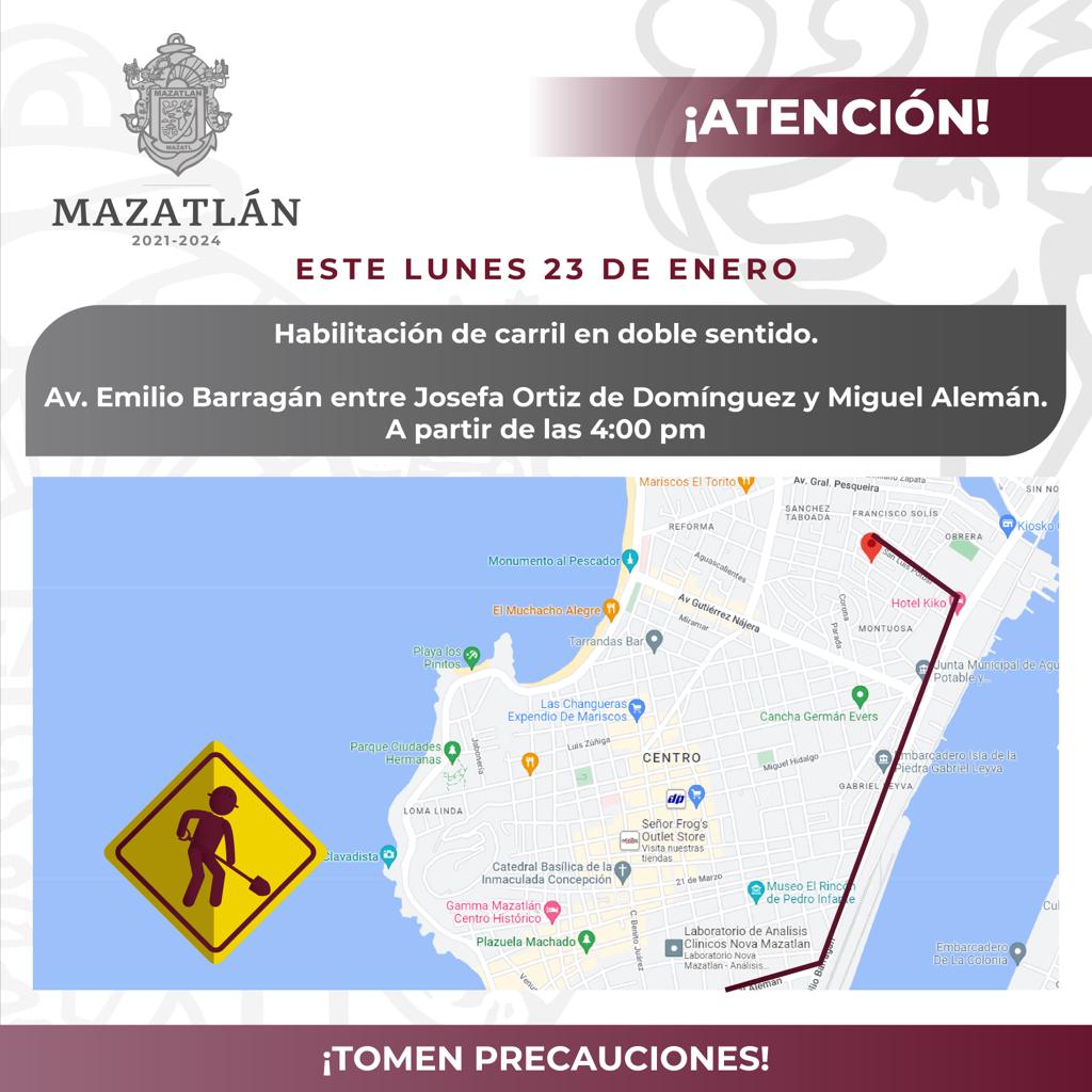 Mazatlán, Sinaloa a 23 de enero del 2023.- Para que tomen sus precauciones conductores que circulen por la avenida Emilio Barragán, El Gobierno Municipal, a través de la Dirección de Obras Públicas y el departamento de Tránsito, realizarán a partir de este lunes a las 16:00 horas el cierre de un carril de la vialidad, desde la altura la calle José Ortiz de Domínguez hasta llegar a Miguel Alemán.