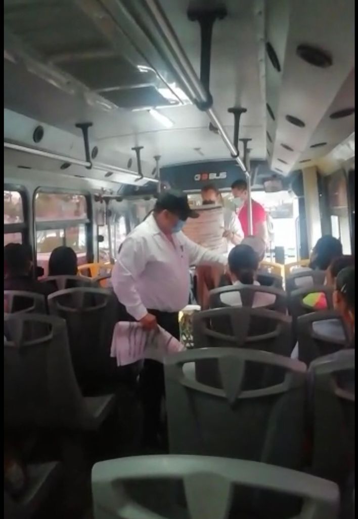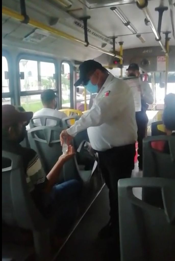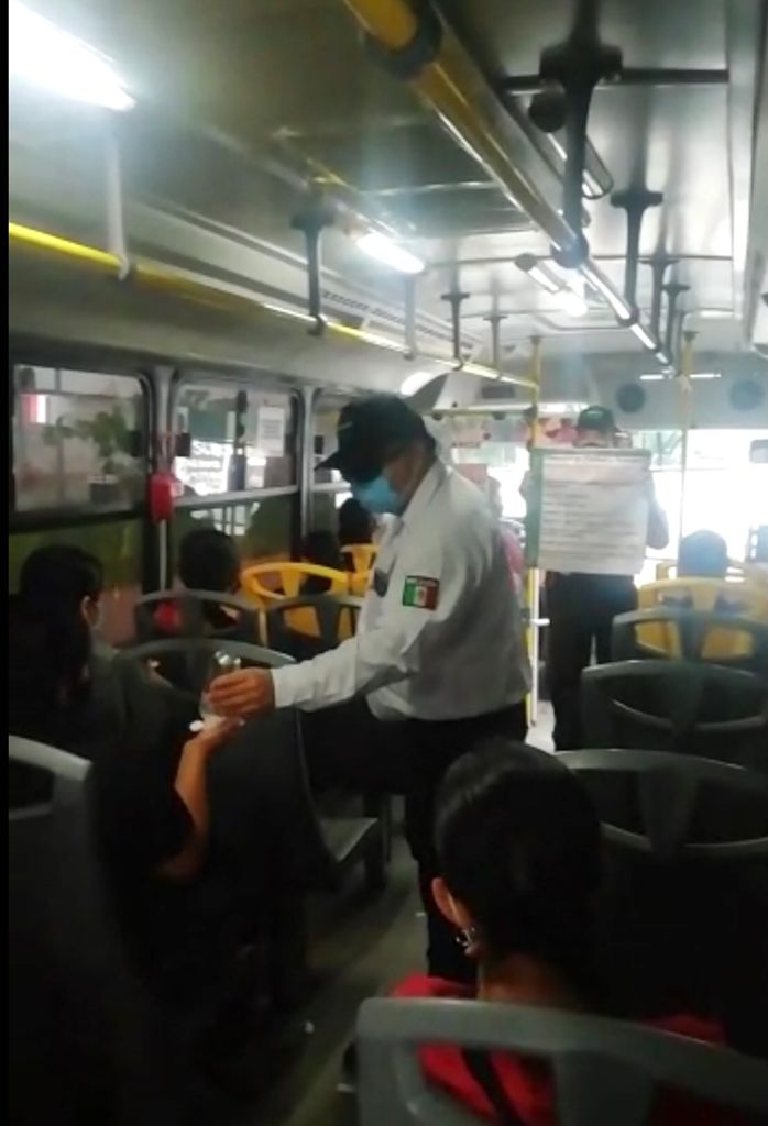 Además, mientras uno de los inspectores, cartulina en mano enumeraba las recomendaciones de la Secretaría de Salud, otro de los inspectores recorría todos los asientos para colocar gel antibacterial a los pasajeros.
