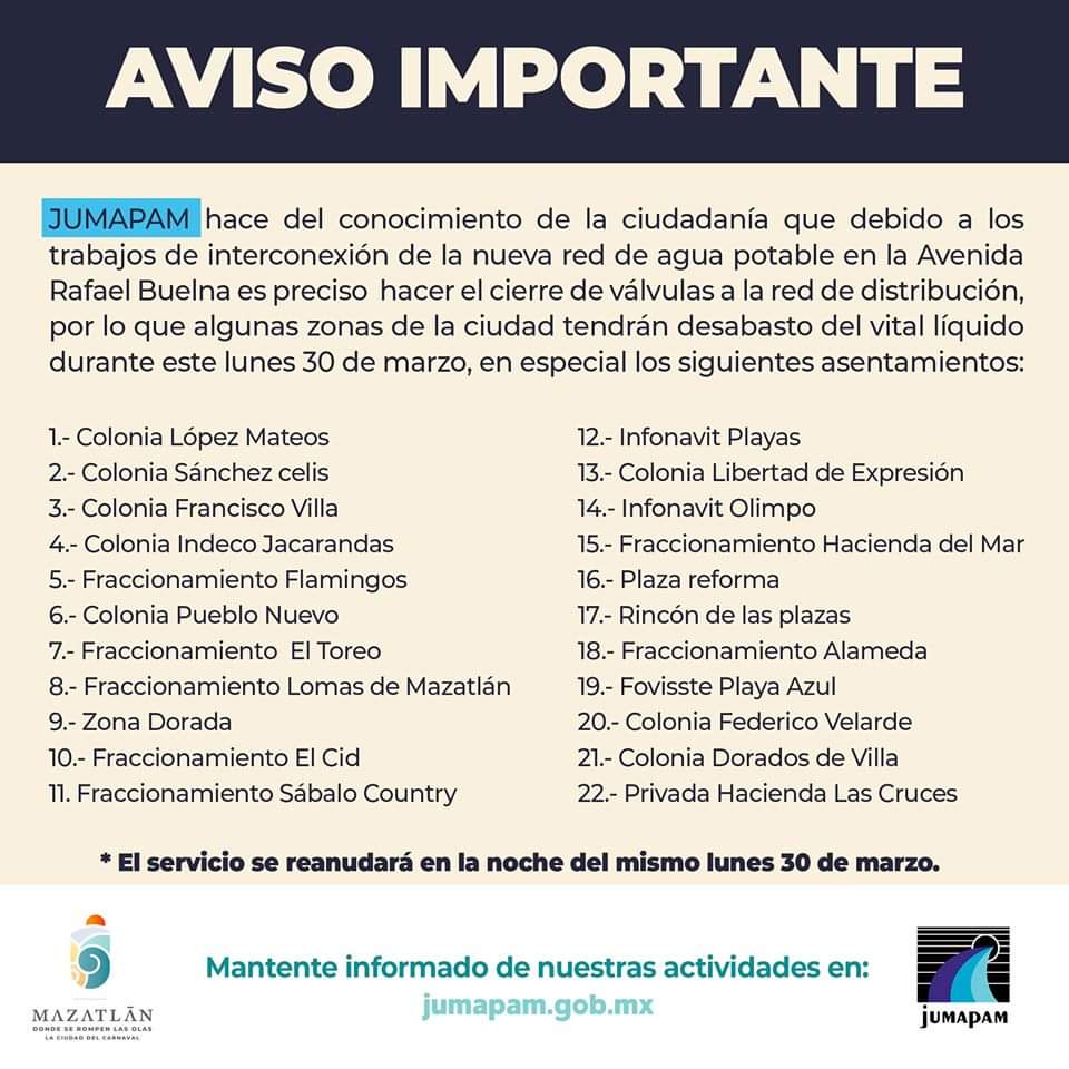 Es importante destacar, que desde la Gerencia General de Jumapam, a cargo del Ingeniero Ismael Tiznado Ontiveros, se está dando especial seguimiento a esta importante maniobra, con la encomienda de darle celeridad, ya que de la prontitud y efectividad con que se realice, dependerá que se reanude lo antes posible el suministro de agua potable en la Avenida Rafael Buelna y que éste se restablezca para 22 colonias de la ciudad, que son las aledañas a la vialidad.