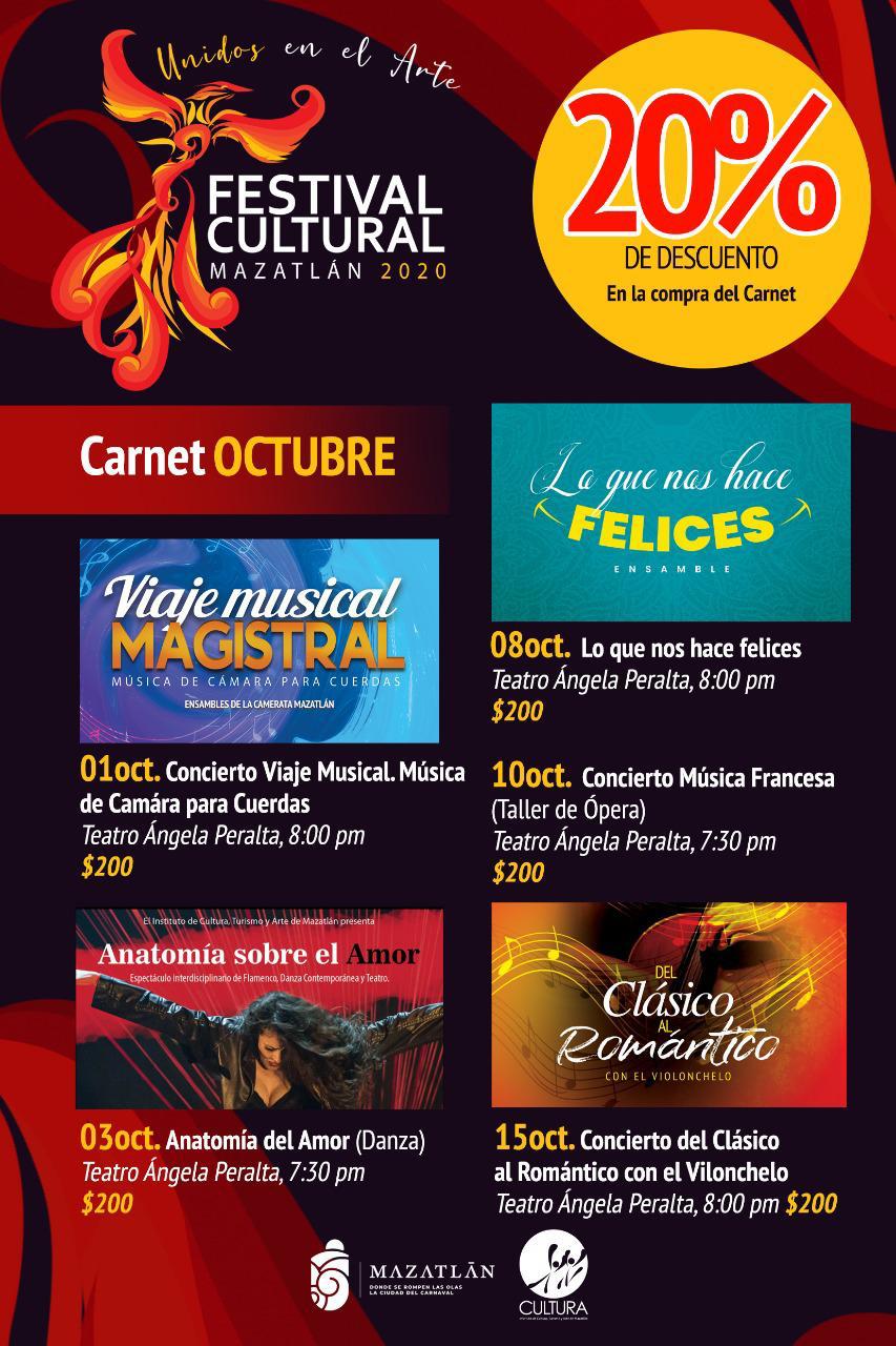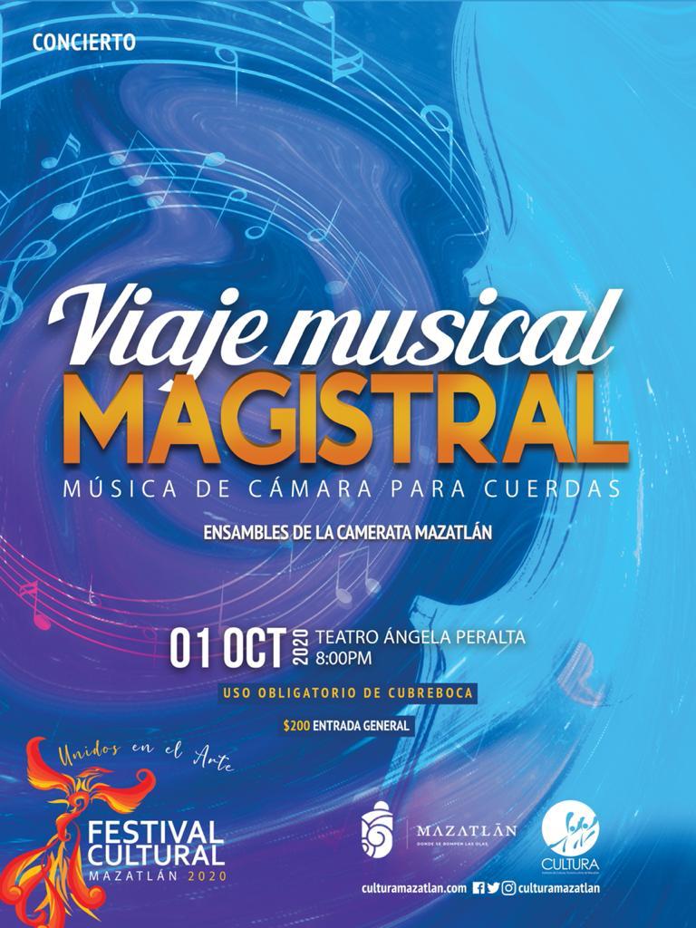 Mazatlán, Sinaloa.- El jueves 1 de octubre, a las 20:00 horas inicia el Festival Cultural Mazatlán 2020 en el Teatro Ángela Peralta con la presentación del concierto “Viaje musical magistral”, protagonizado por Ensamble de Cuerdas de la Camerata Mazatlán.