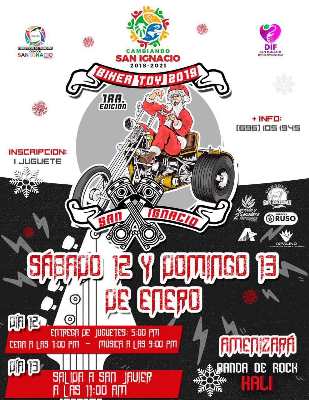 Mazatlán, Sin., enero 09 de 2018.- Con el propósito de propiciar la afluencia turística “con causa”, este sábado y domingo se efectuará en San Ignacio, la primera edición del “Biker Toy”, con la participación de cuando menos 500 motociclistas de la entidad, cuya cuota de inscripción será un juguete que será entregado a niños de diferentes comunidades de ese municipio.