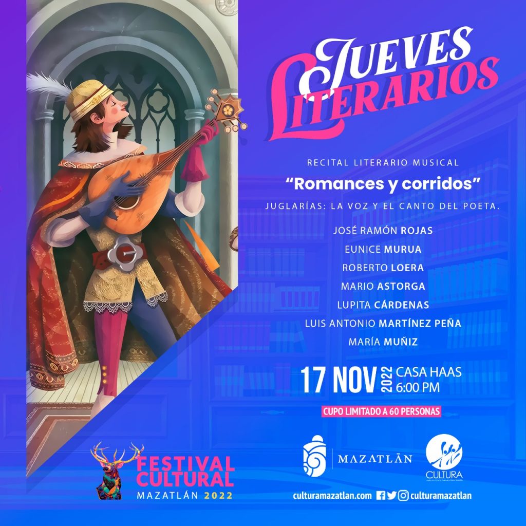 Mazatlán, Sinaloa, 15 de noviembre de 2022.- Poesía, música, historias cantadas, un ameno e interesante programa cultural con la participación del grupo Juglarías, llegará a Casa Haas el 17 de noviembre a las 18:00 horas a través del programa “Jueves Literario”. La entrada es gratuita.