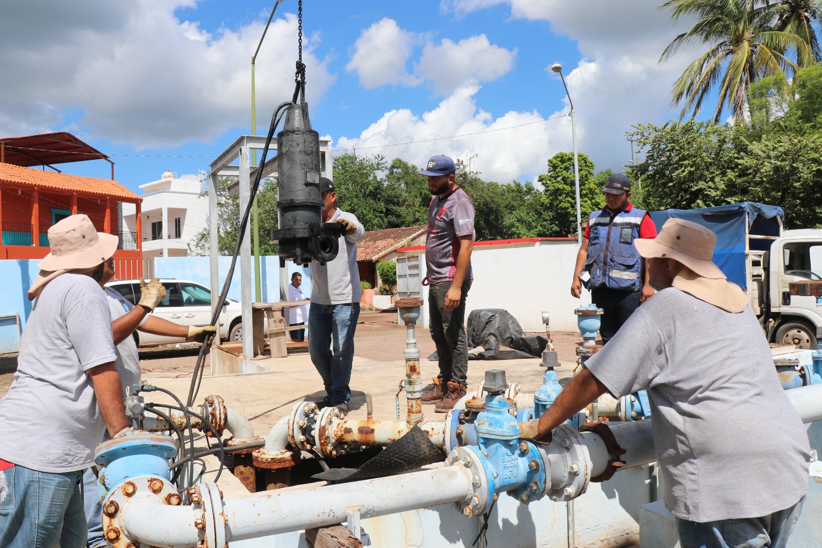 El Quelite, Mazatlán, Sinaloa, 11 de octubre de 2023.- A fin de resolver una falla en el sistema de rebombeo del Cárcamo El Quelite, este miércoles, la Gerencia de Operaciones de Jumapam hizo el cambio de una bomba de 20 caballos de fuerza, equipo que permitirá un mejor desfogue de las aguas residuales hacia la planta de tratamiento.