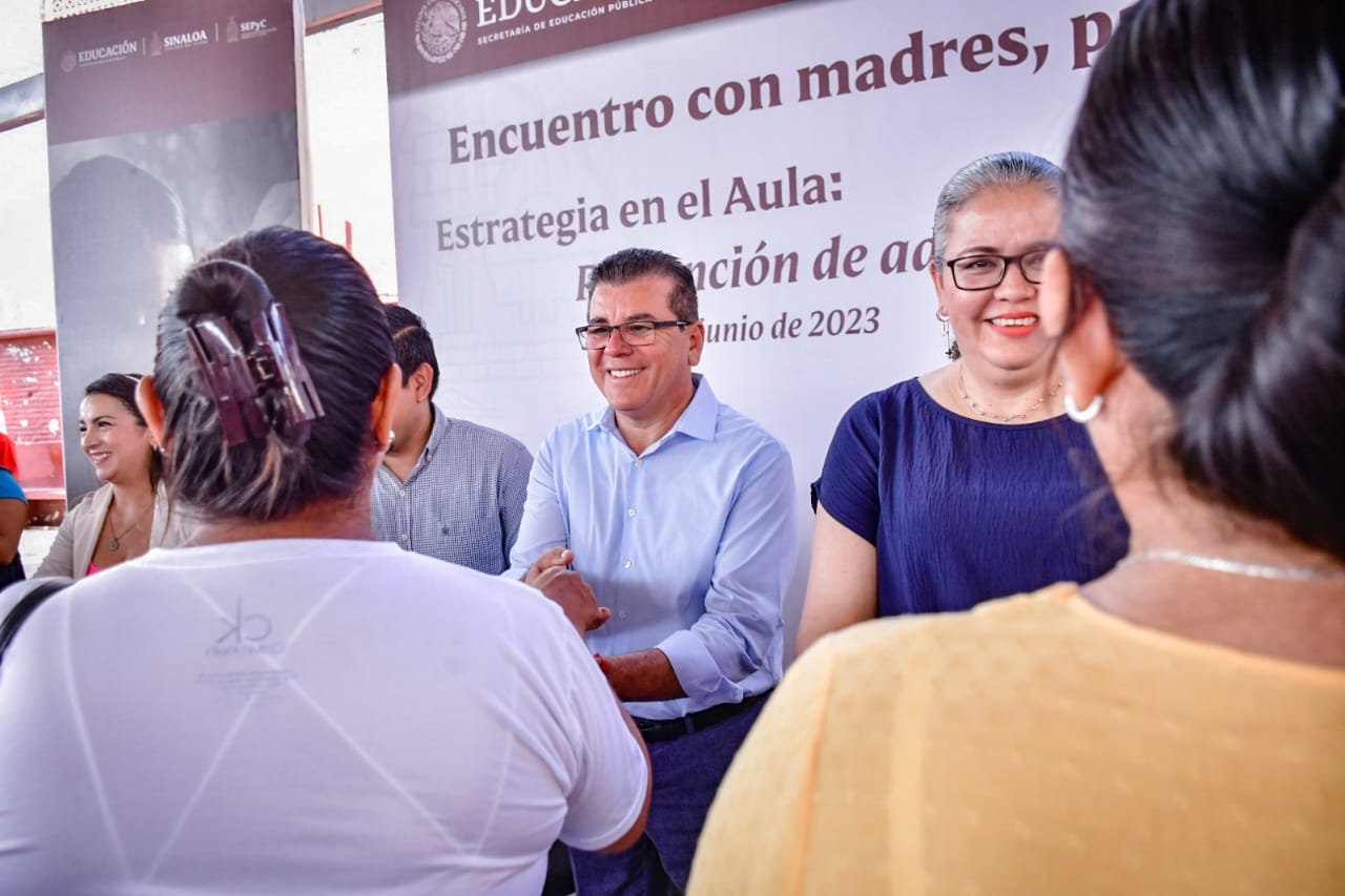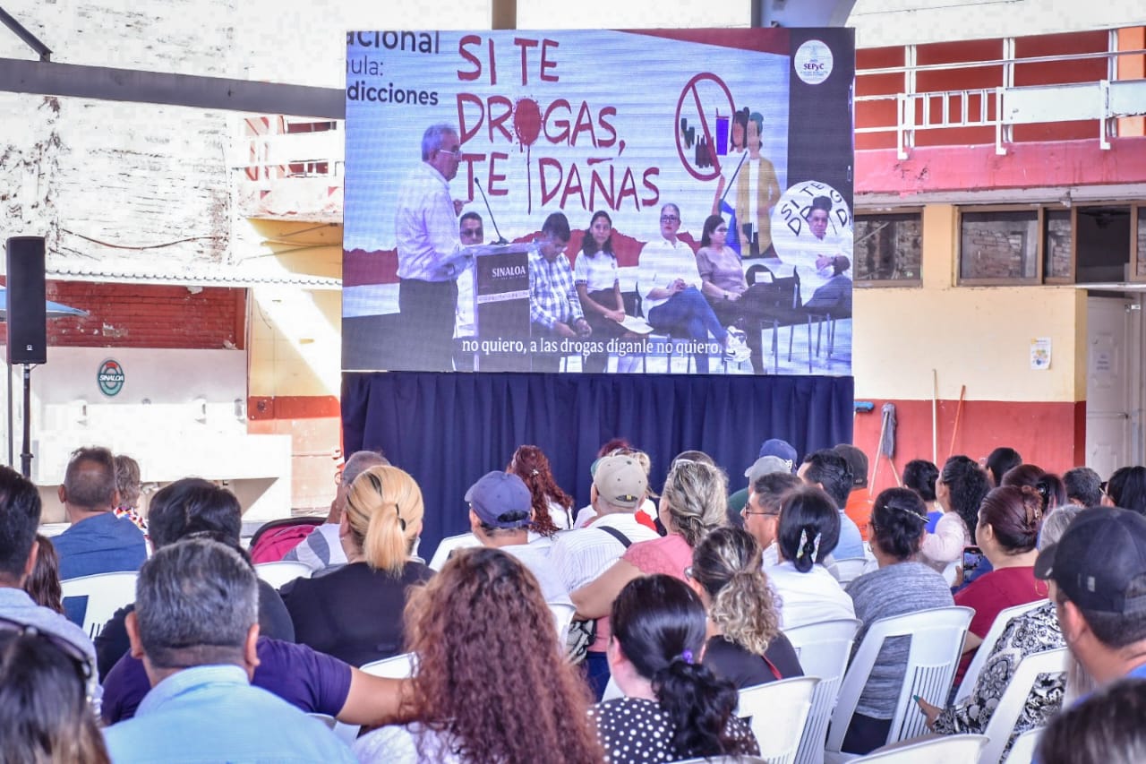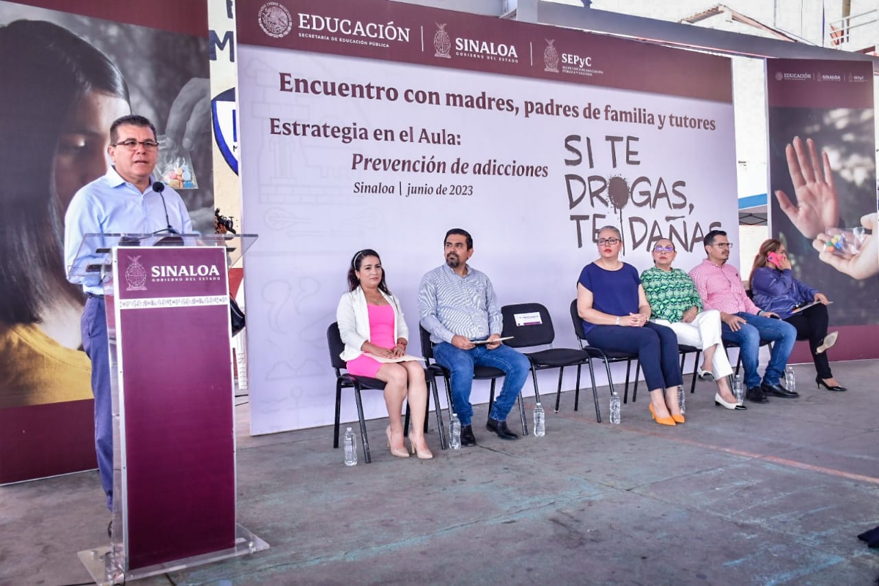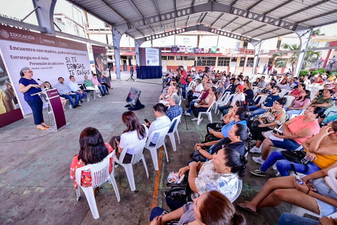 Mazatlán, Sinaloa, 20 de junio de 2023.- Generar espacios de diálogo entre padres de familia y autoridades educativas es un área de oportunidad para transformar y construir entornos protectores desde las familias y escuelas, por ello, esta mañana autoridades estatales y municipales sostuvieron un encuentro con madres, padres de familia y tutores para compartir la estrategia implementada en las aulas de educación básica para prevenir adicciones “Si te drogas, te dañas”.