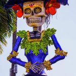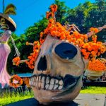 La escultura combina el uso de flores naturales, estructuras metálicas y una estética inspirada en la tradición mexicana de honrar a los difuntos, adaptada al lenguaje contemporáneo y festivo de las celebraciones mazatlecas.