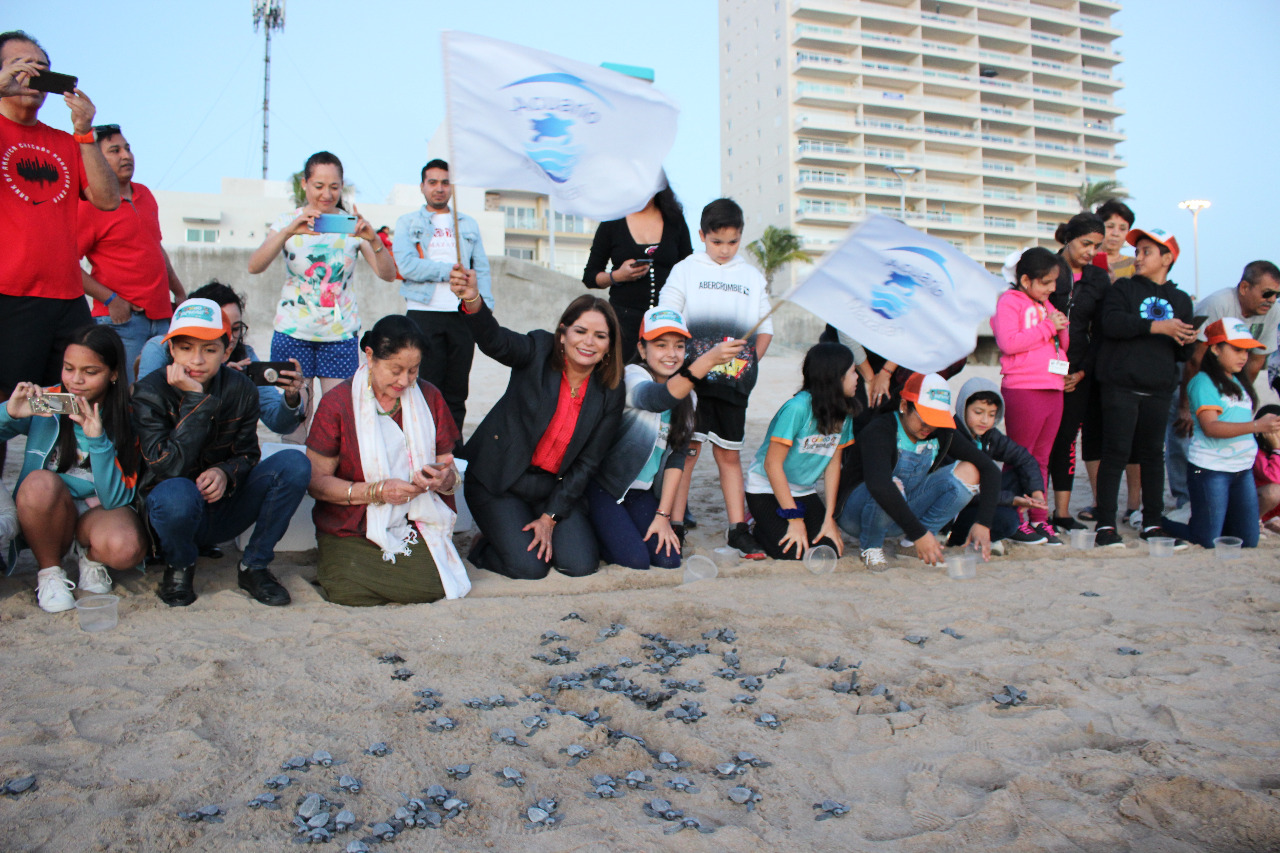 Mazatlán.- En un emotivo acto de protección a la vida silvestre, esta tarde Acuario Mazatlán liberó 183 tortugas golfinas, en las playas del puerto.