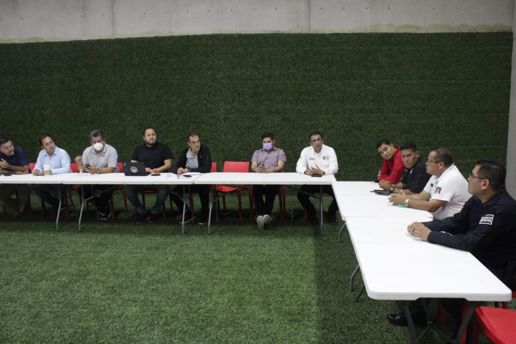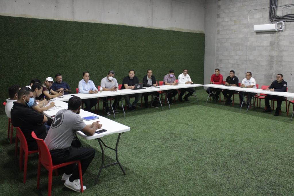Mazatlán.- Autoridades de Seguridad Pública, Tránsito Municipal, Liga MX, Protocolos de presidencia municipal, Subdirección de Comercio y Proteccion Civil, se reunieron esta tarde para afinar los detalles del operativo de bioseguridad de implementarán este martes en El Kraken, con motivo del partido entre Mazatlán FC contra el equipo Santos de Torreón.