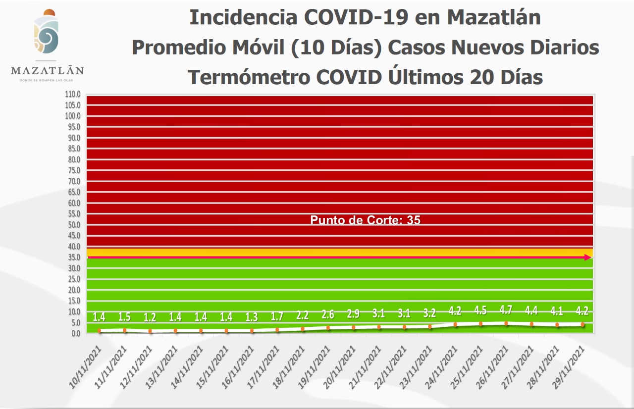 Cristian Castillo López, encargado de Protocolos y Sanidad del Ayuntamiento, dijo que Mazatlán amaneció hoy con 27 pacientes y se mantiene en color verde del Semáforo Epidemiológico Estatal y del Termómetro del Municipio, que se ubicó en los 4.2 grados Covid.