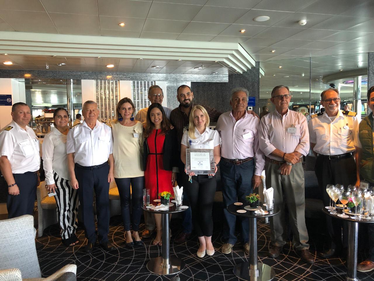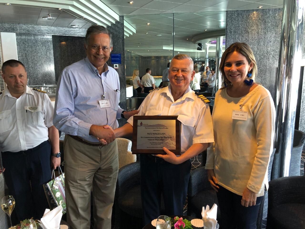 El Director de Proyectos Especiales de la Sectur, Alfonso Gil Díaz, entregó una placa conmemorativa al Capitán del Magellan, Valentín Zhukov, por su primer arribo a esta ciudad. Estuvo acompañado por el Director de la Administración Portuaria Integral (API) Jorge González Olivieri, e Iván Pico, de la dirección de turismo municipal, entre otros.