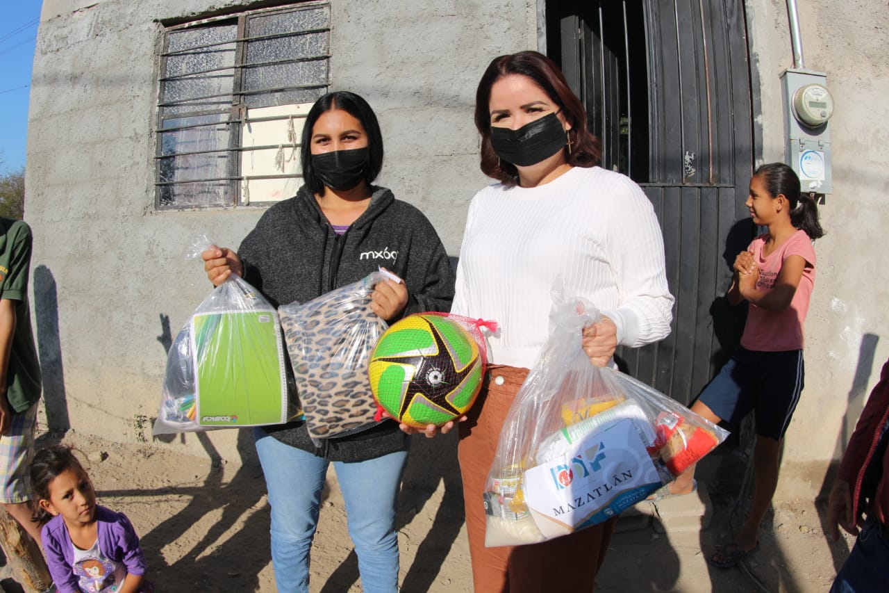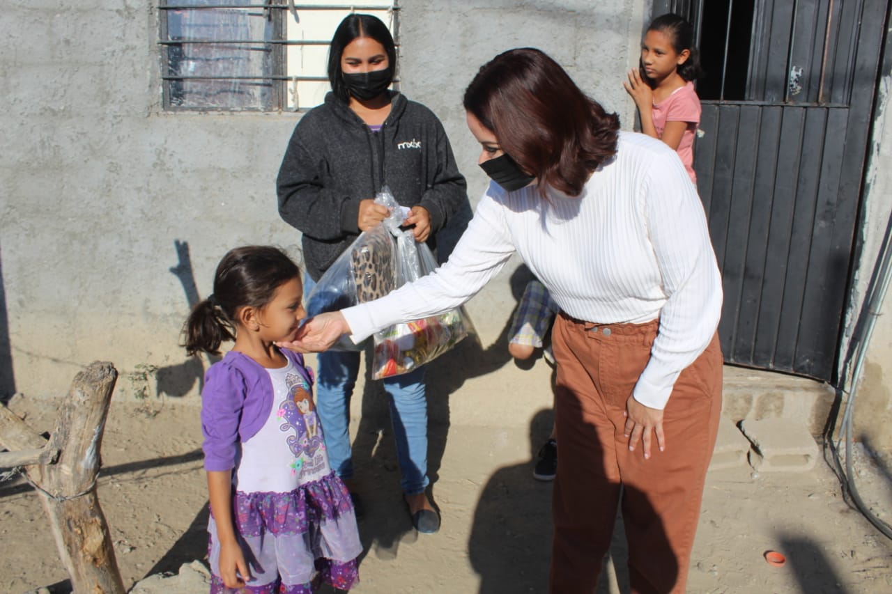 La presidenta de DIF Municipal, Gabriela Peña Chico, llevó personalmente los apoyos directamente en los domicilios de los beneficiados, a quienes entregó despensa con productos de la canasta básica, así como frazadas, kits de regalos y juguetes
