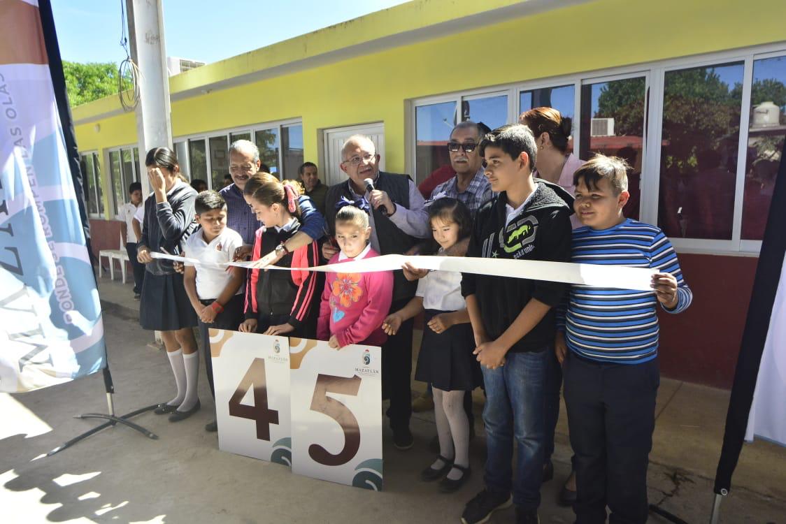 En El Puente de El Quelite, 26 alumnos de la Primaria Niños Héroes ya tienen baños nuevos. El Alcalde visitó el año pasado la escuela y observó que los sanitarios eran indignos, por lo que dio instrucciones para la construcción de unos nuevos, con una inversión 704 mil 220.65 pesos.