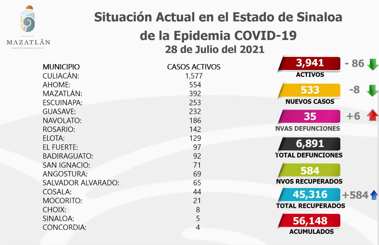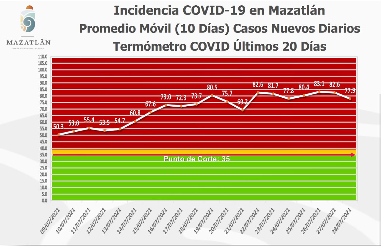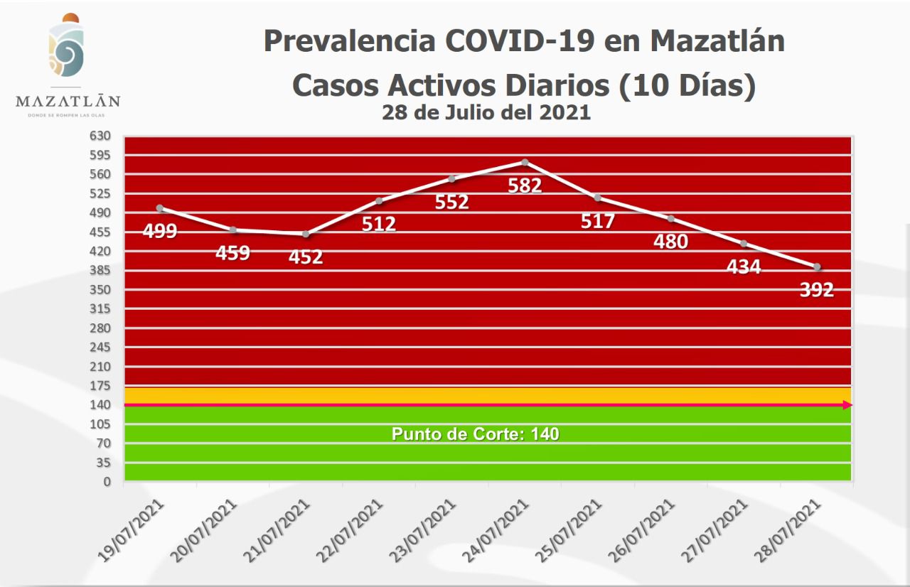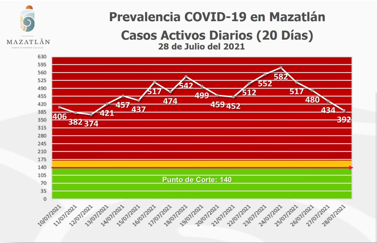 Mencionó que Mazatlán continúa en color rojo del Semáforo Epidemiológico Estatal y en tercer lugar de casos activos en Sinaloa, por superado por los municipios de Culiacán y Ahome que este día tienen mil 577 y 554 respectivamente.