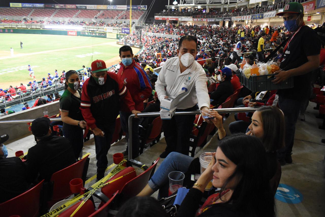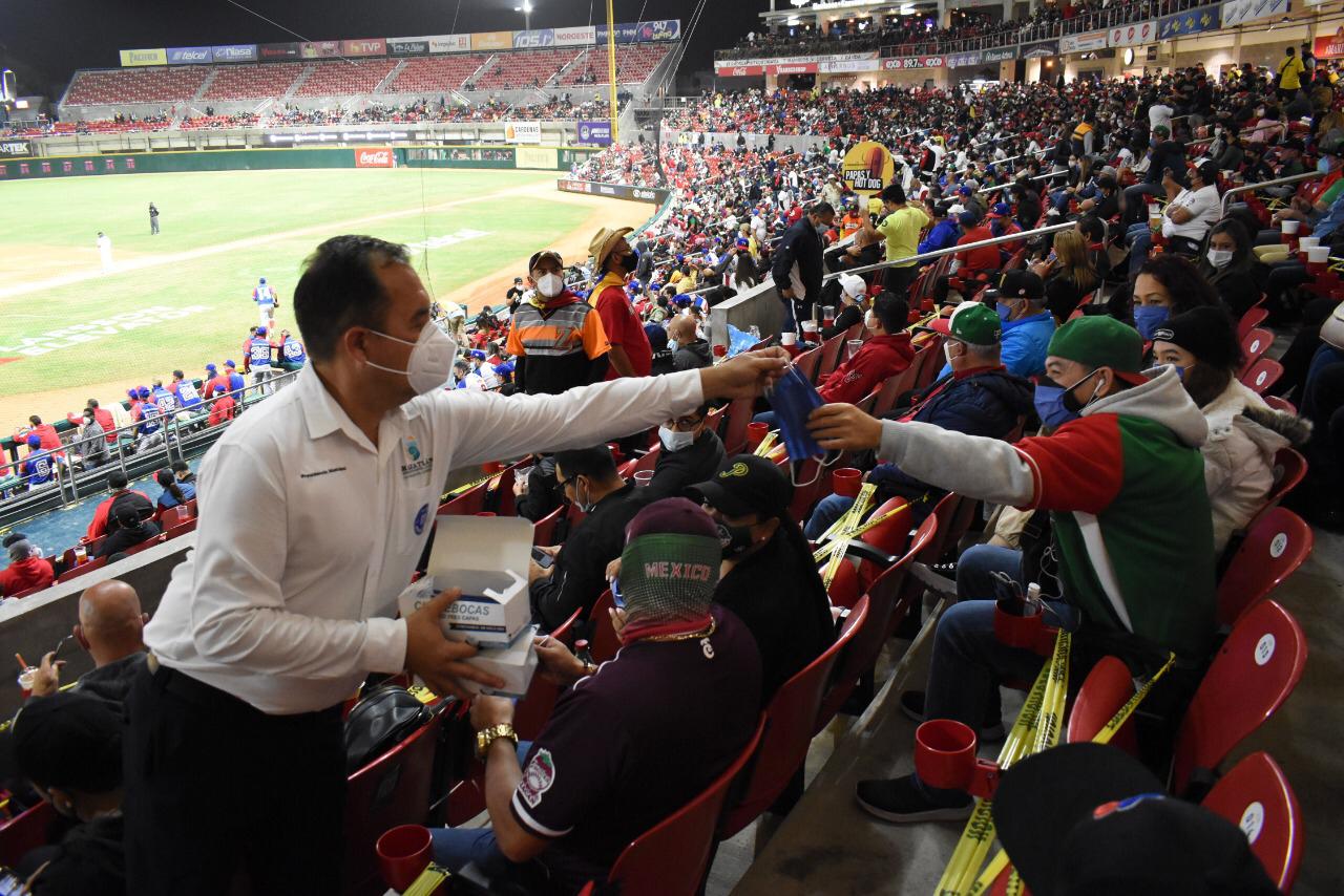 Mazatlán.- Con el fin de proteger la salud de los asistentes de la Serie del Caribe Mazatlán 2021, el Gobierno Municipal reparte cubrebocas certificados entre los asistentes a los juegos que se realizan en el estadio Teodoro Mariscal.