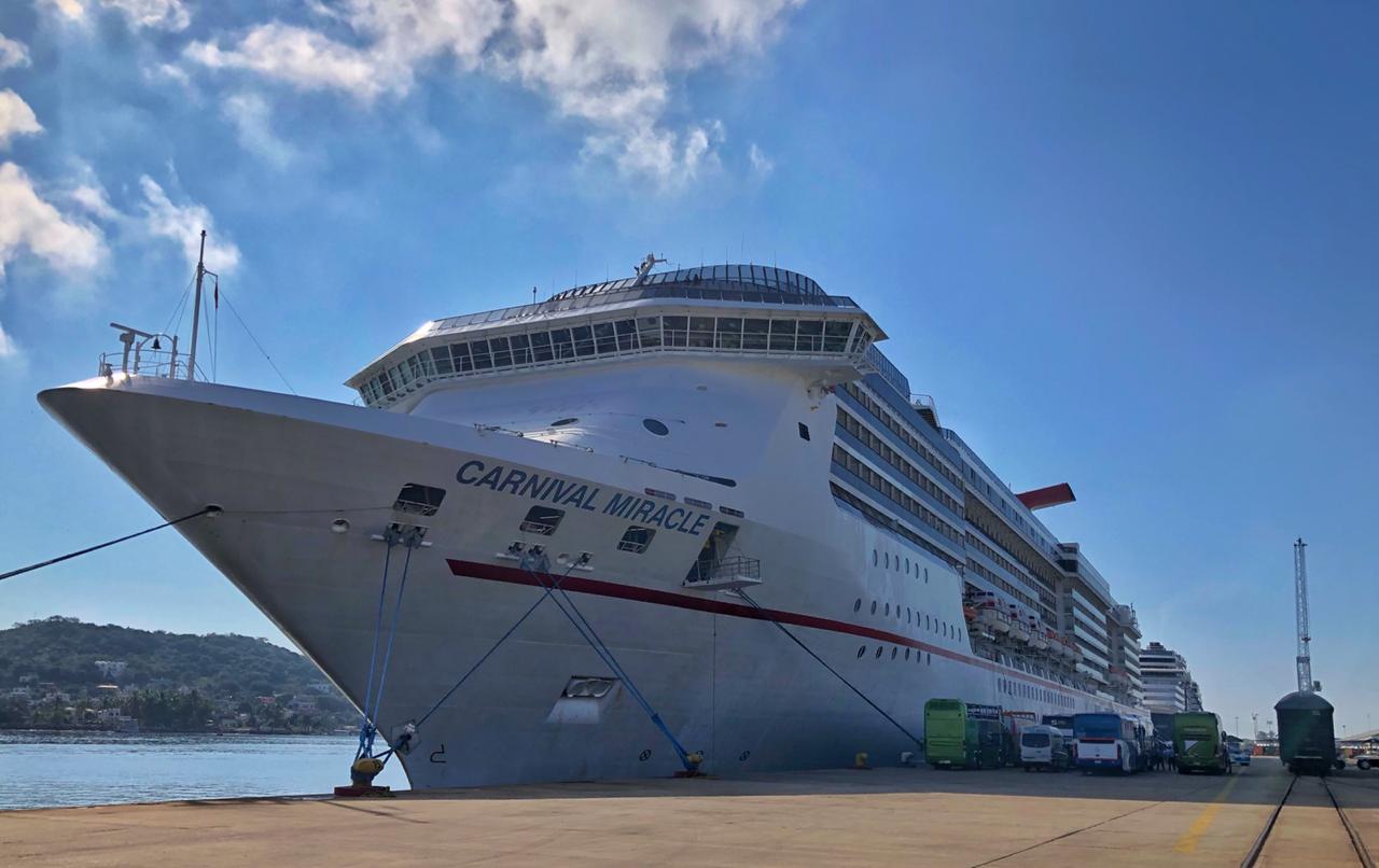Media hora más tarde entró al puerto el Carnival Miracle, proveniente de Cabo San Lucas, con 2,347 pasajeros y 900 tripulantes. De acuerdo a su itinerario marítimo, seguirá su viaje a las 5 de la tarde con rumbo a Puerto Vallarta.