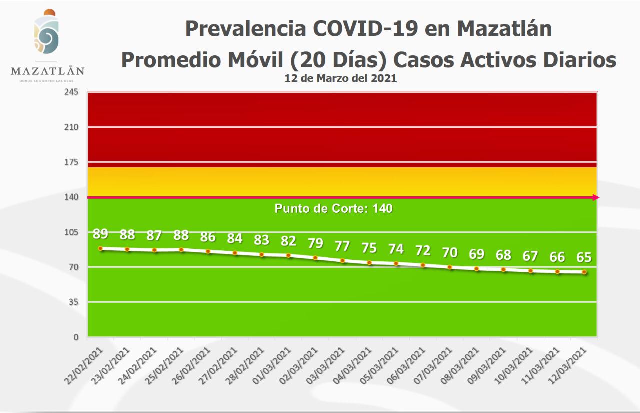 De acuerdo al informe presentado anoche por la dependencia, Mazatlán continúa en color azul del Semáforo Epidemiológico Estatal y se mantiene en la tercera posición en el estado con casos activos del virus Sars-Cov-2, superado por Culiacán que tiene 256 y Ahome 96.