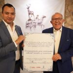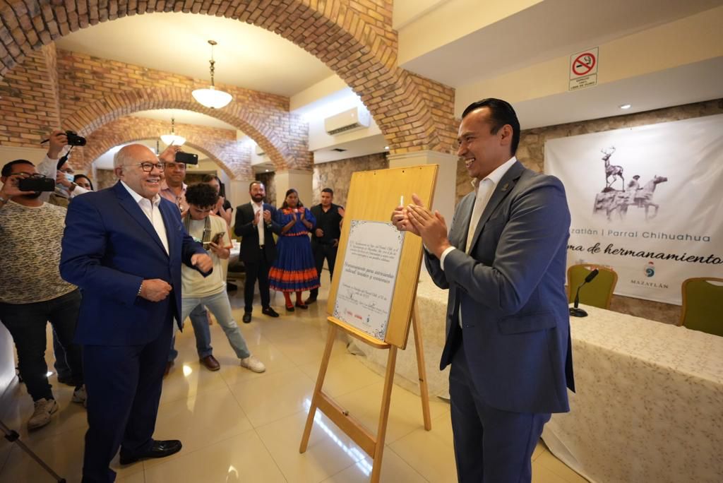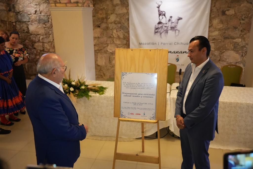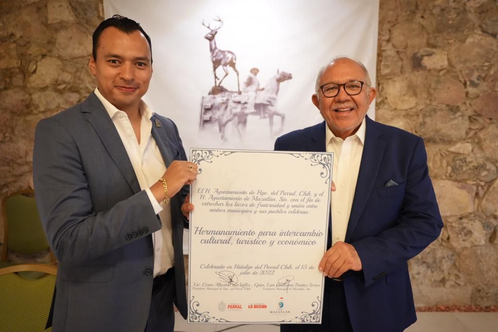 Hidalgo del Parral, CHIH.- Para estrechar lazos de fraternidad y unión entre los municipios de Mazatlán e Hidalgo del Parral, los Alcaldes, Luis Guillermo Benitez Torres y César Peña Valles, celebraron este viernes la firma del acuerdo de hermanamiento para el intercambio cultural, artístico, turístico y económico.