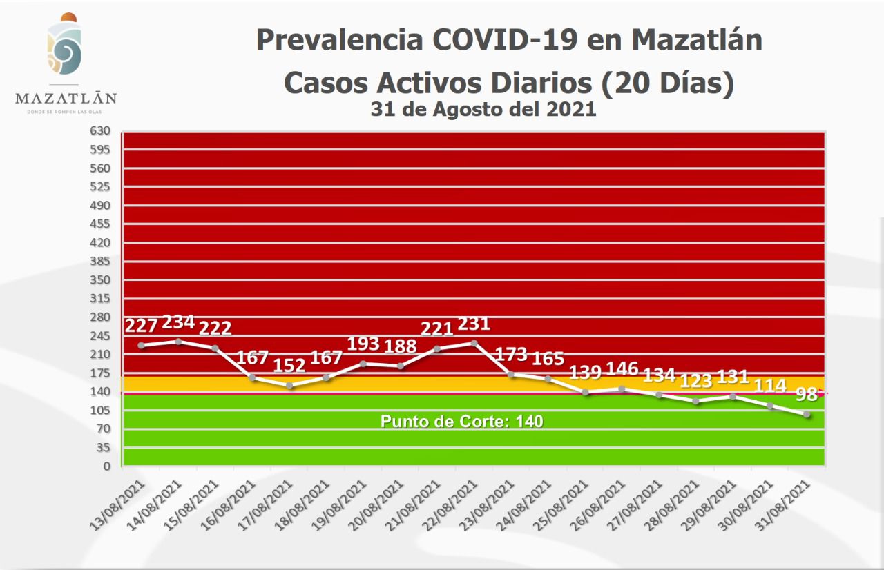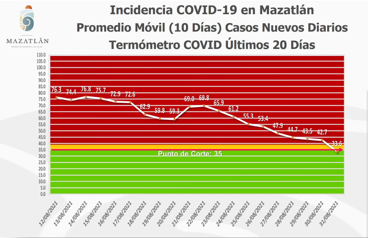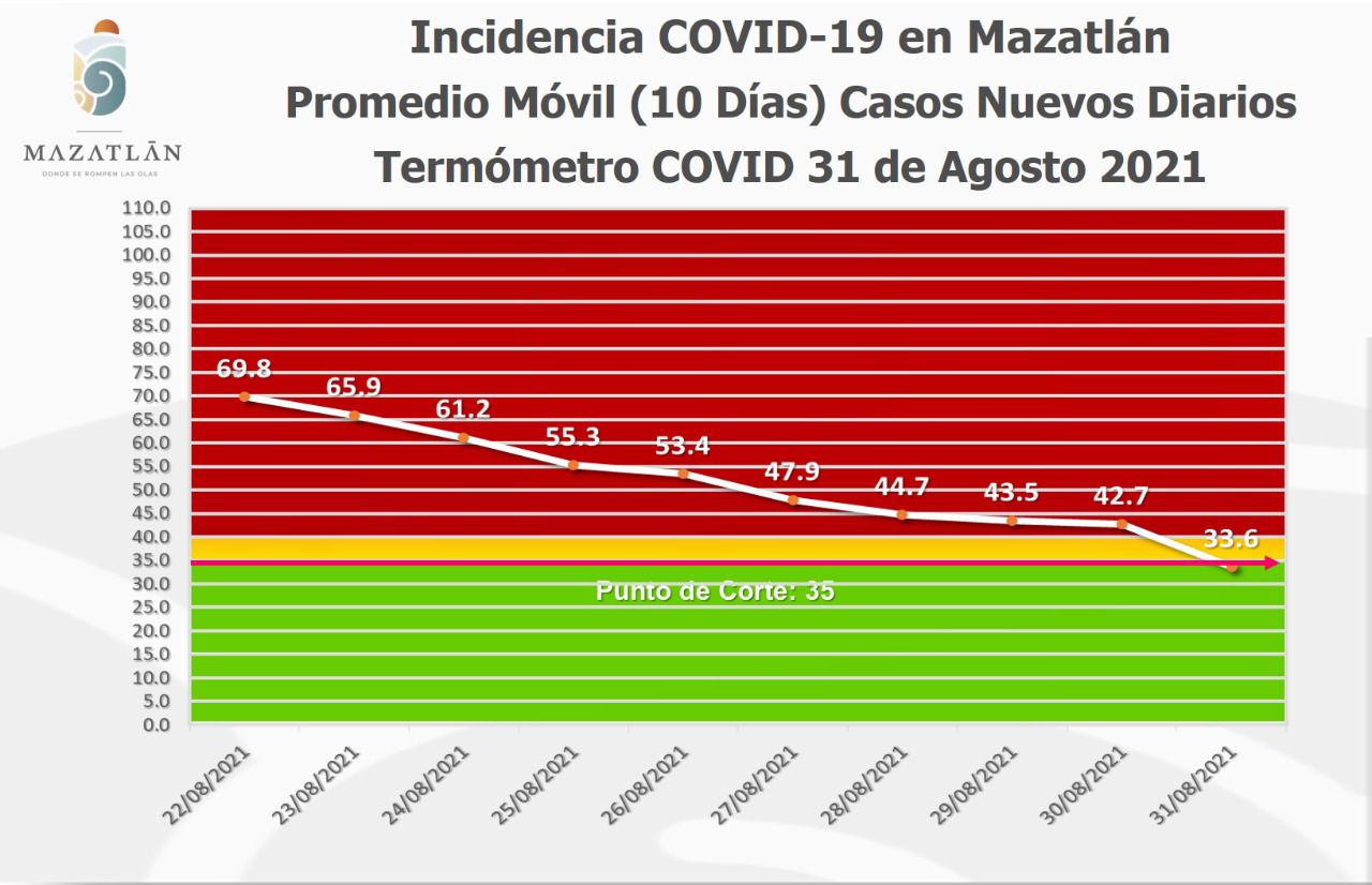 Mazatlán.- Con el inicio del mes de septiembre y en medio de la tercera ola de la pandemia, este municipio descendió al color verde del Semáforo Epidemiológico Estatal y del Termómetro Covid del Ayuntamiento, informó Cristian Castillo López.