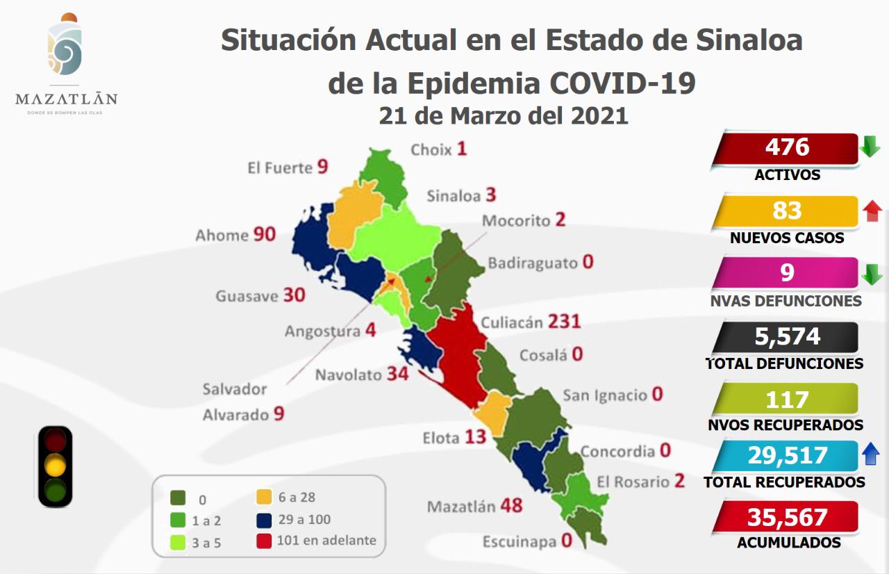 El también Jefe de Comunicación Interna de la Oficina de Presidencia en el Ayuntamiento comentó que Mazatlán continúa en color azul en el Semáforo Epidemiológico Estatal y es tercero en casos de Covid, por debajo de los municipios de Culiacán con 231 y Ahome con 90.