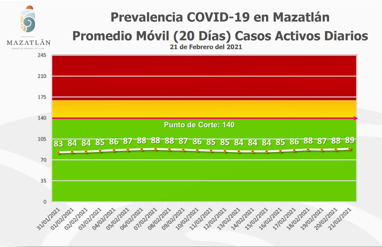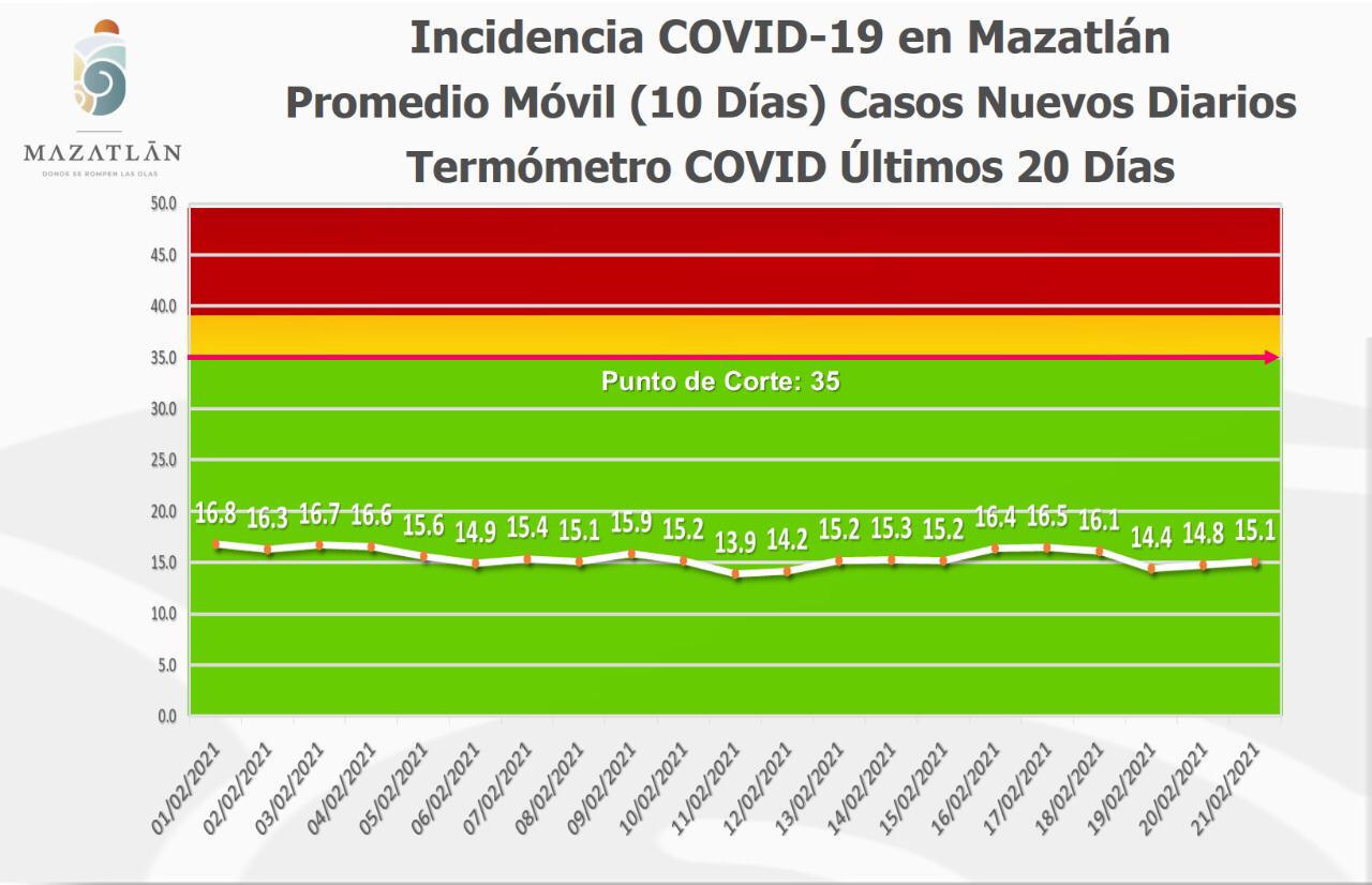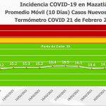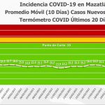 Agregó que los indicadores del Gobierno de Mazatlán registraron un leve incremento promedio de los 10 últimos días, por lo que el Termómetro de Casos Nuevos Diarios se ubicó en los 15.1 grados Covid, mientras que el Termómetro de Casos Activos Diarios subió de 88 a 89 personas con la enfermedad.