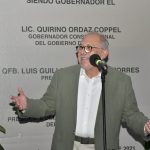 Dentro de una imponente sala al interior del acuario, el Químico destacó el trabajo y la dedicación del Mandatario estatal para rescatar a Mazatlán, e hizo alusión a la Plaza de Toros México, donde esta noche Quirino Ordaz Coppel saldría en hombros luego de haber «cortado orejas y rabo».