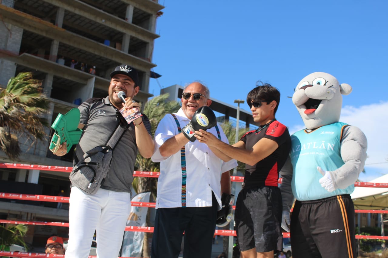 El mazatleco, Janiel Rivera y Karim Arce realizan entrenamiento público previo a su combate de este sábado en el Centro de Usos Múltiples