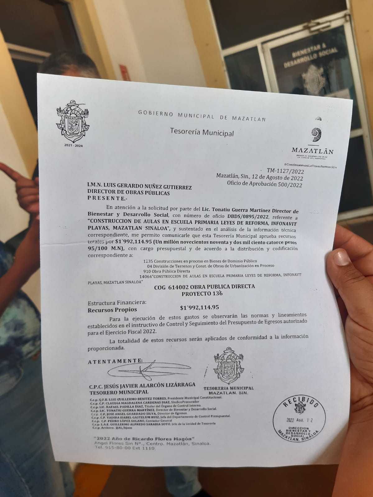 El director de Bienestar y Desarrollo Social, Tonatiu Guerra Martínez con el oficio de aprobación de la obra en mano, explicó que sí se les cumplió a los padres de familia.
