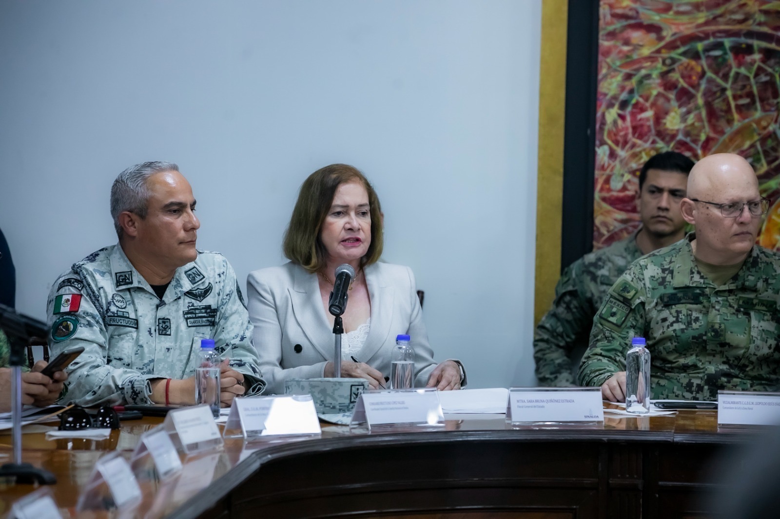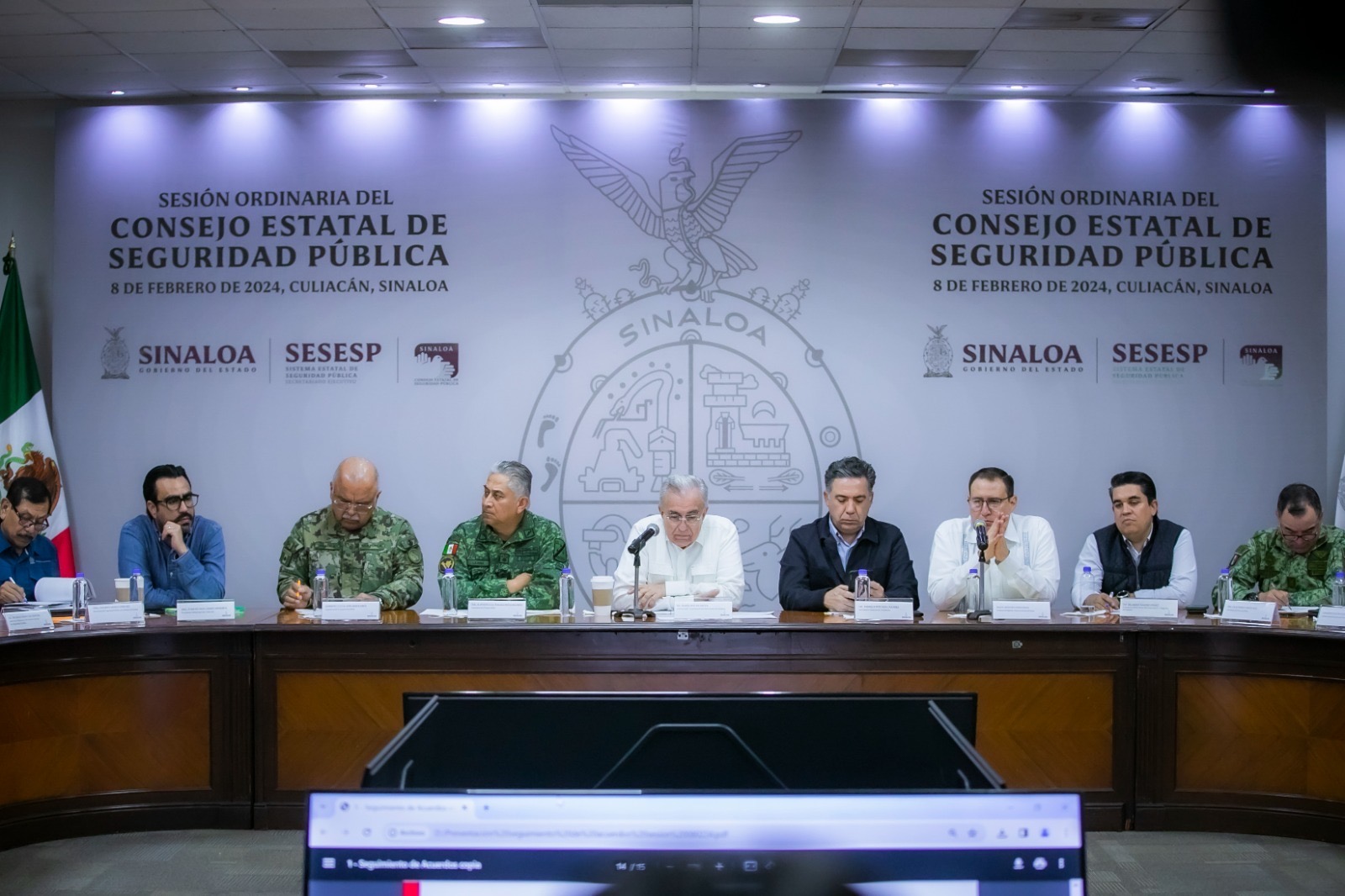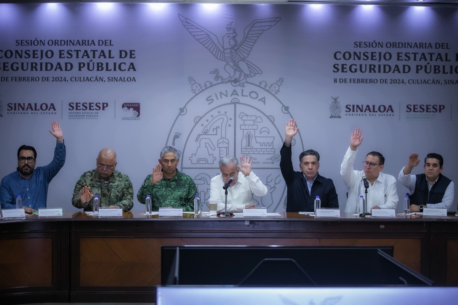 Durante esta sesión ordinaria, que duró tres horas, hubo varias intervenciones, como la del comandante de la Tercera Región Militar, general Francisco Jesús Leana Ojeda; del comandante de la Octava Región Naval Militar, almirante Javier Abarca García; del coordinador estatal de la Guardia Nacional, general Fructuoso López Vallejo; de la fiscal general del Estado, Sara Bruna Quiñones Estrada; del responsable de la Fiscalía General de la República en Sinaloa, Gonzalo Hernández Durazo; del secretario de Seguridad Pública, Genaro Mérida Sánchez; y del coordinador general y consejero ciudadano del Consejo Estatal de Seguridad Pública, Miguel Calderón Quevedo, quienes informaron de las acciones realizadas por sus respectivas instituciones militares y civiles.
