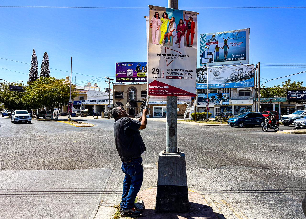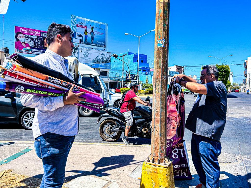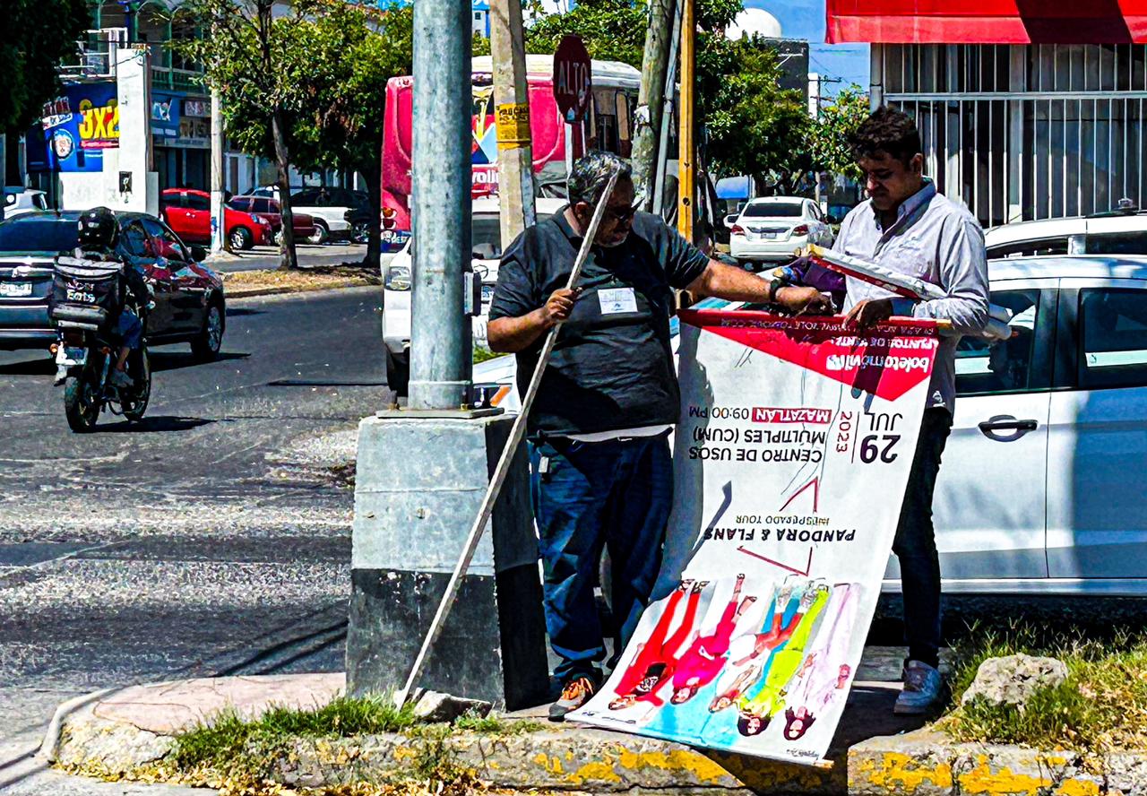 Mazatlán, Sinaloa 16 de mayo 2023.- Con el fin de regularizar el número de pendones que se observan por la ciudad, oficialía mayor inició con un operativo de revisión para determinar cuáles cuentan con permiso y retirar los que se han colocado de manera irregular.