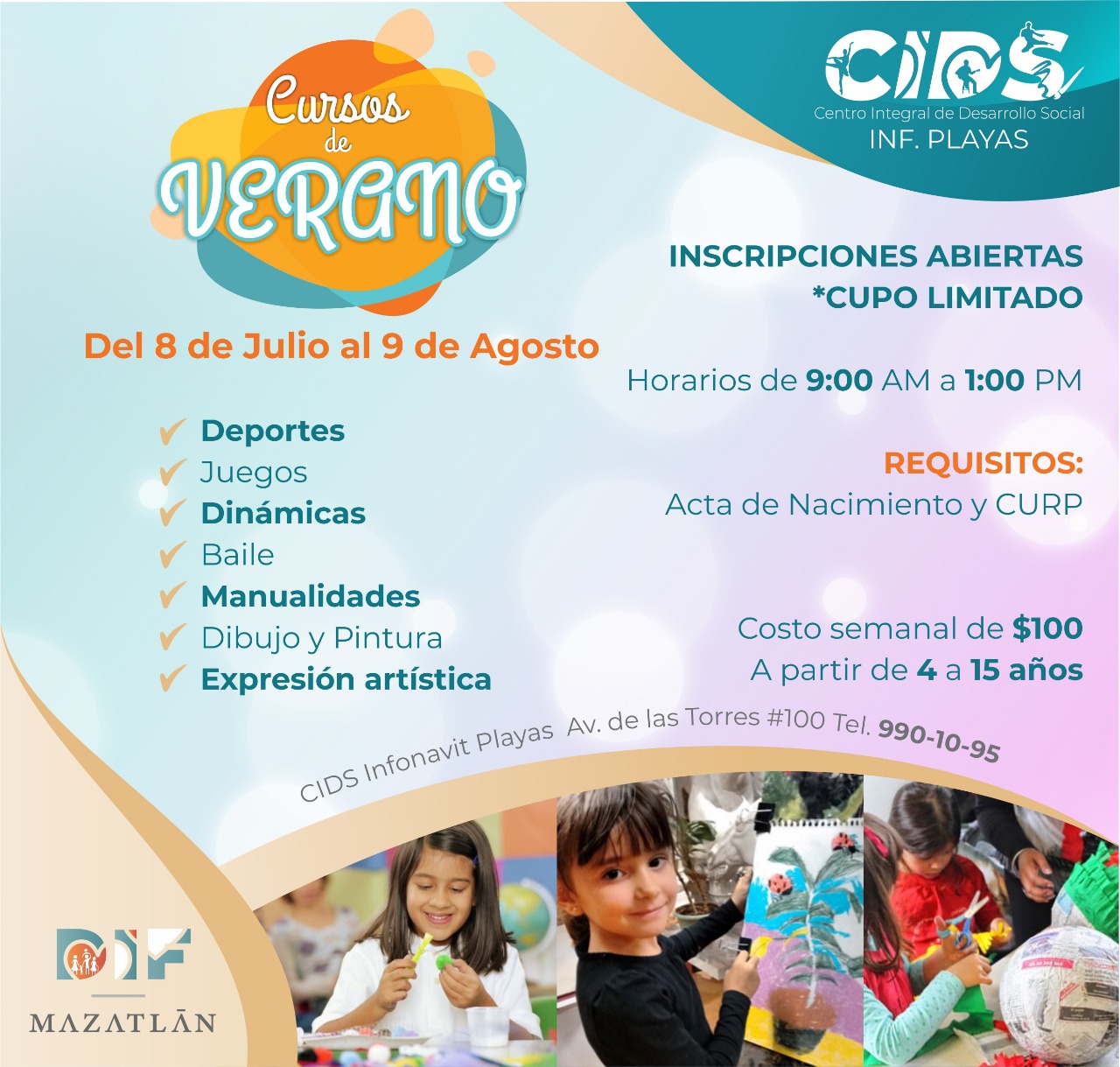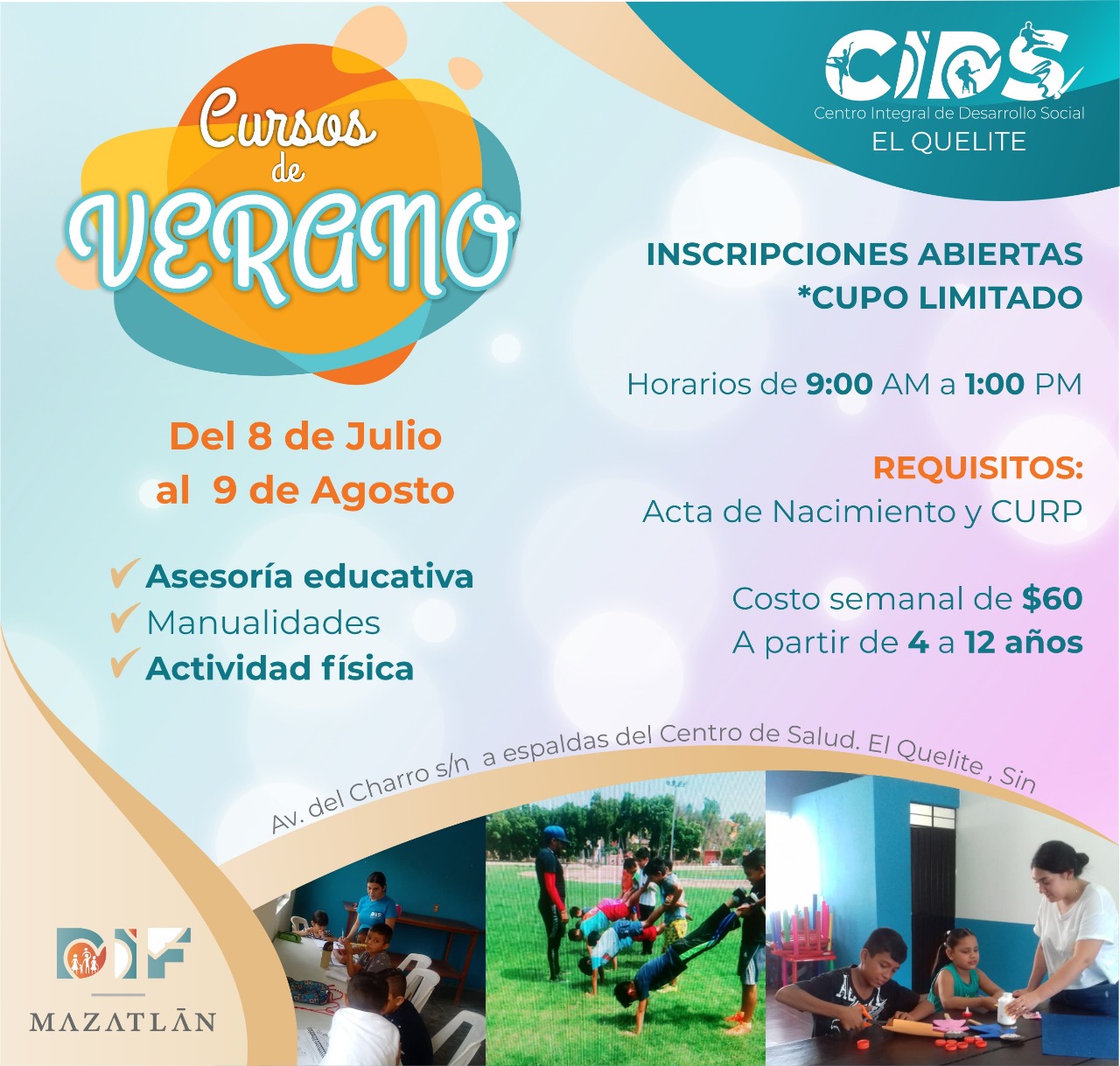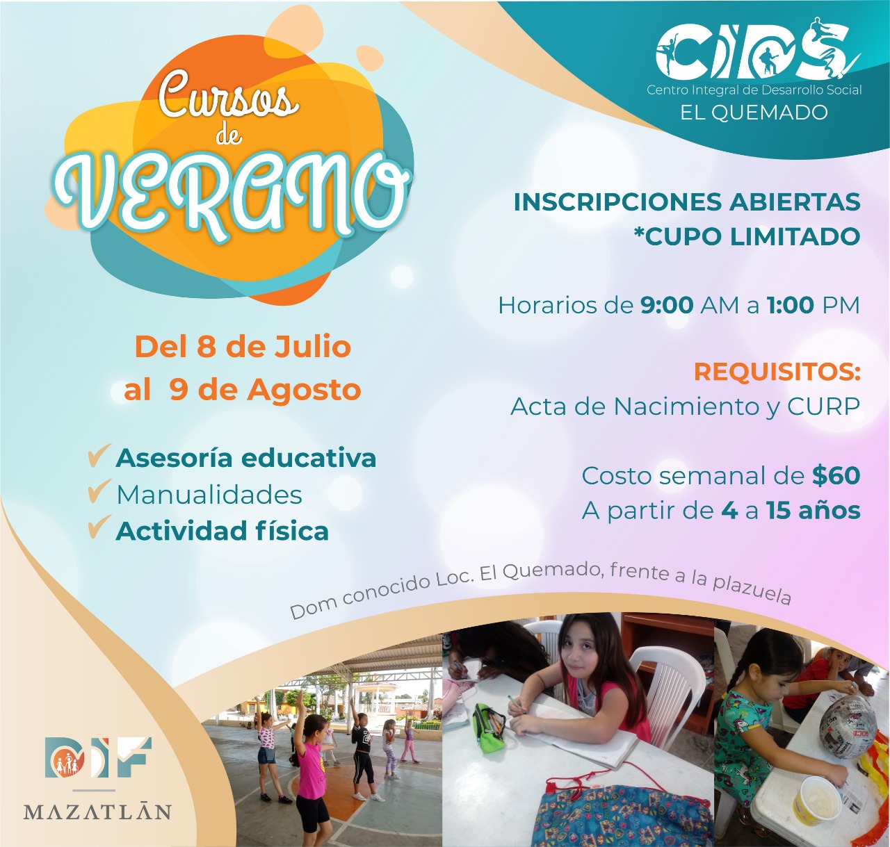 El Sistema DIF Mazatlán ofrecerá cursos de verano en los Centros Integrales de Desarrollo Social de Infonavit Playas, El Quemado, El Quelite y Villa Unión, del 8 de julio al 9 de agosto.
