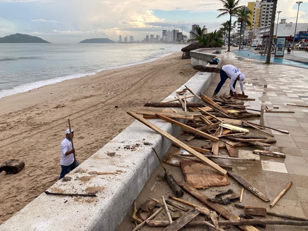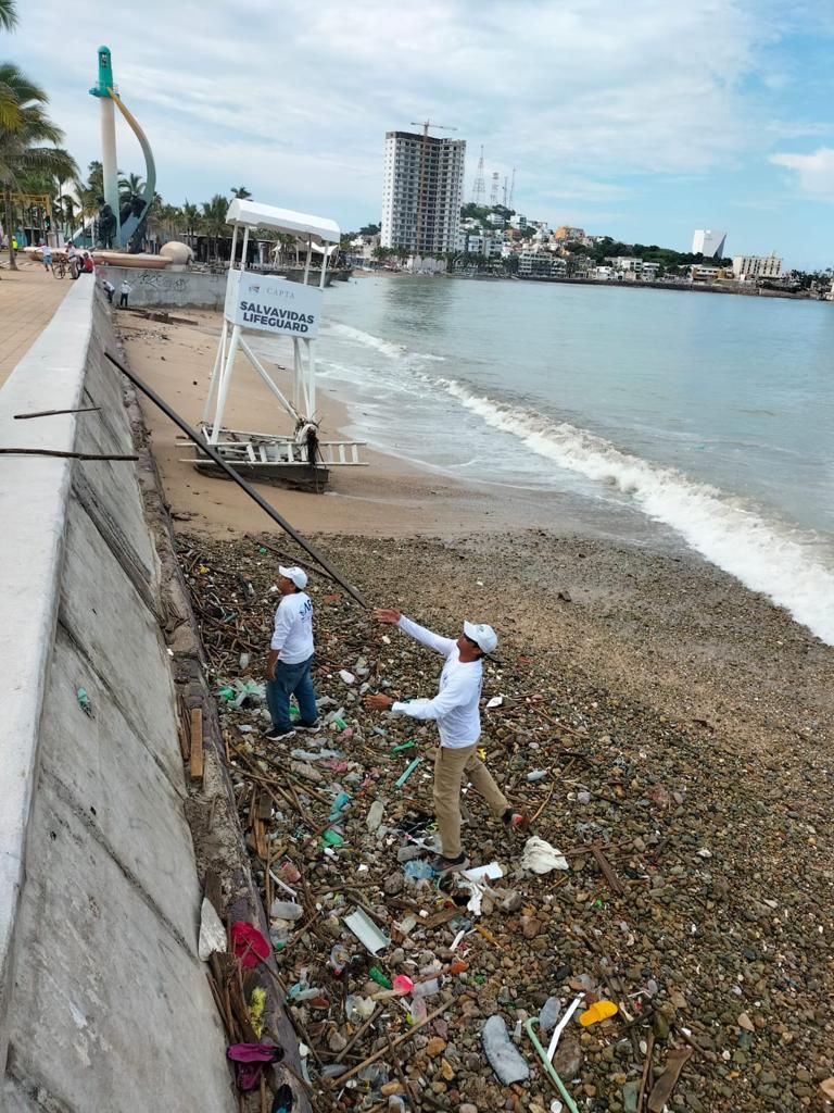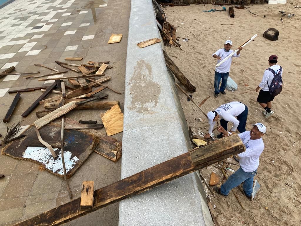 Desde las 6:00 de la mañana, hasta las 12:00 del mediodía, el personal recogió mayoritariamente palos y grandes troncos del sitio, que fueron arrojados por el mar debido a las lluvias que se han registrado en zonas serranas del municipio, además de restos de palapas que fueron dañadas por el fuerte oleaje que se registró en días pasados.