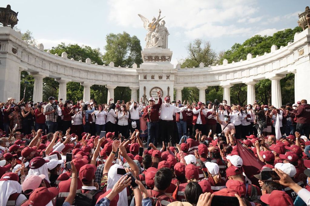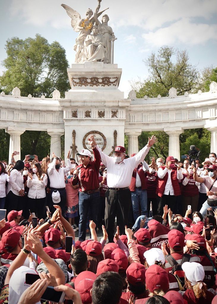 Ciudad de México.- Acompañado por los próximos gobernadores Lorena Cuéllar, de Tlaxcala; Alfredo Ramírez Bedolla, de Michoacán; y Rubén Rocha Moya, de Sinaloa, el presidente nacional de Morena, Mario Delgado Carrillo, encabezó en el Hemiciclo a Juárez la “Fiesta de la Democracia”.