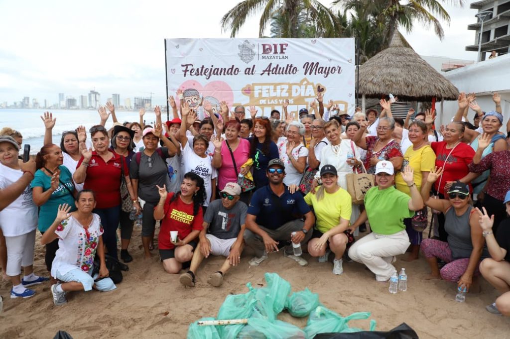 Mazatlán, Sinaloa, a 08 de agosto de 2023.- Como parte de las actividades del Día de las y los Abuelos, a celebrarse el próximo 28 de agosto, personas adultas mayores participaron en la limpieza de un tramo de playa de avenida Del Mar.