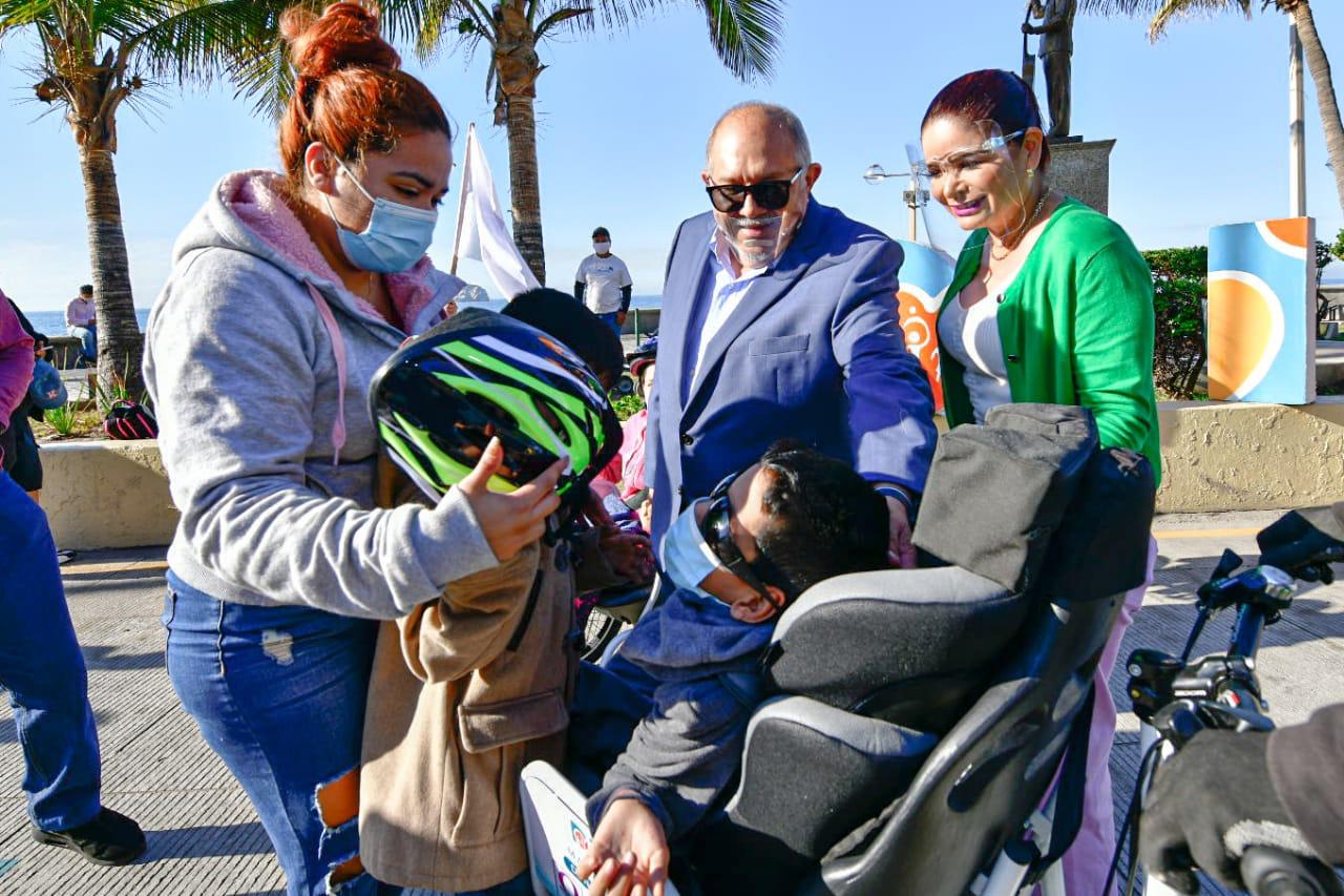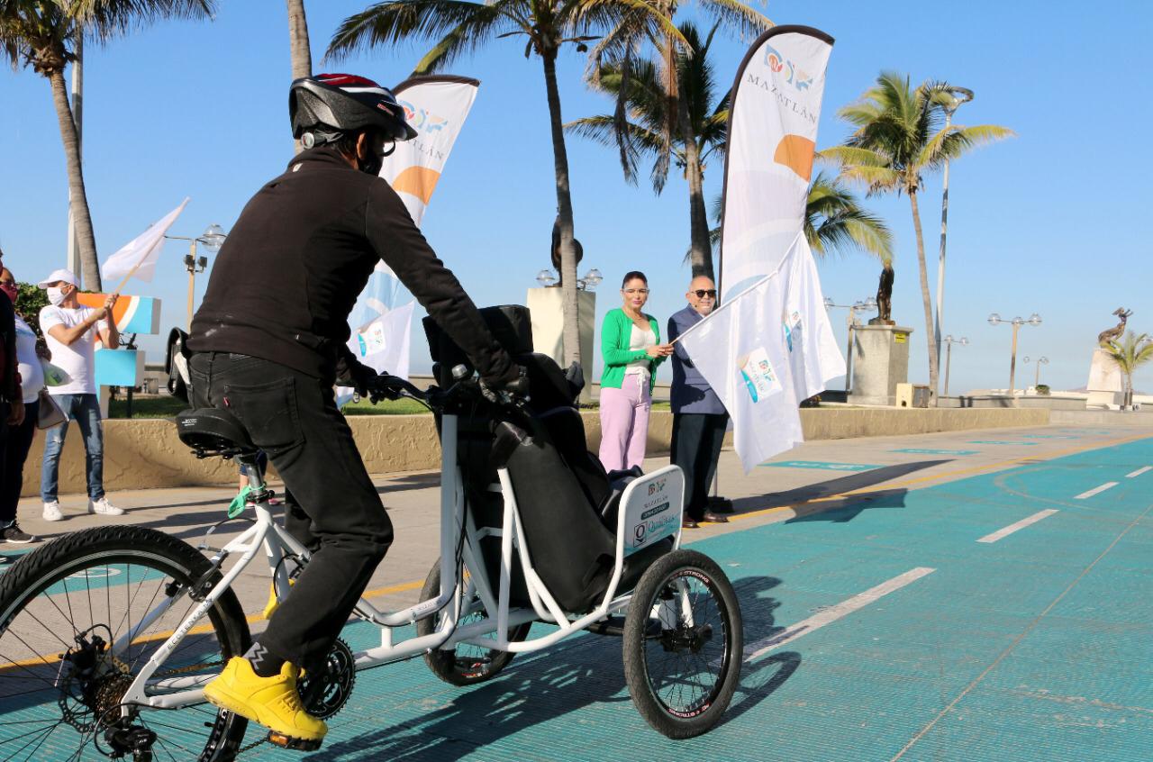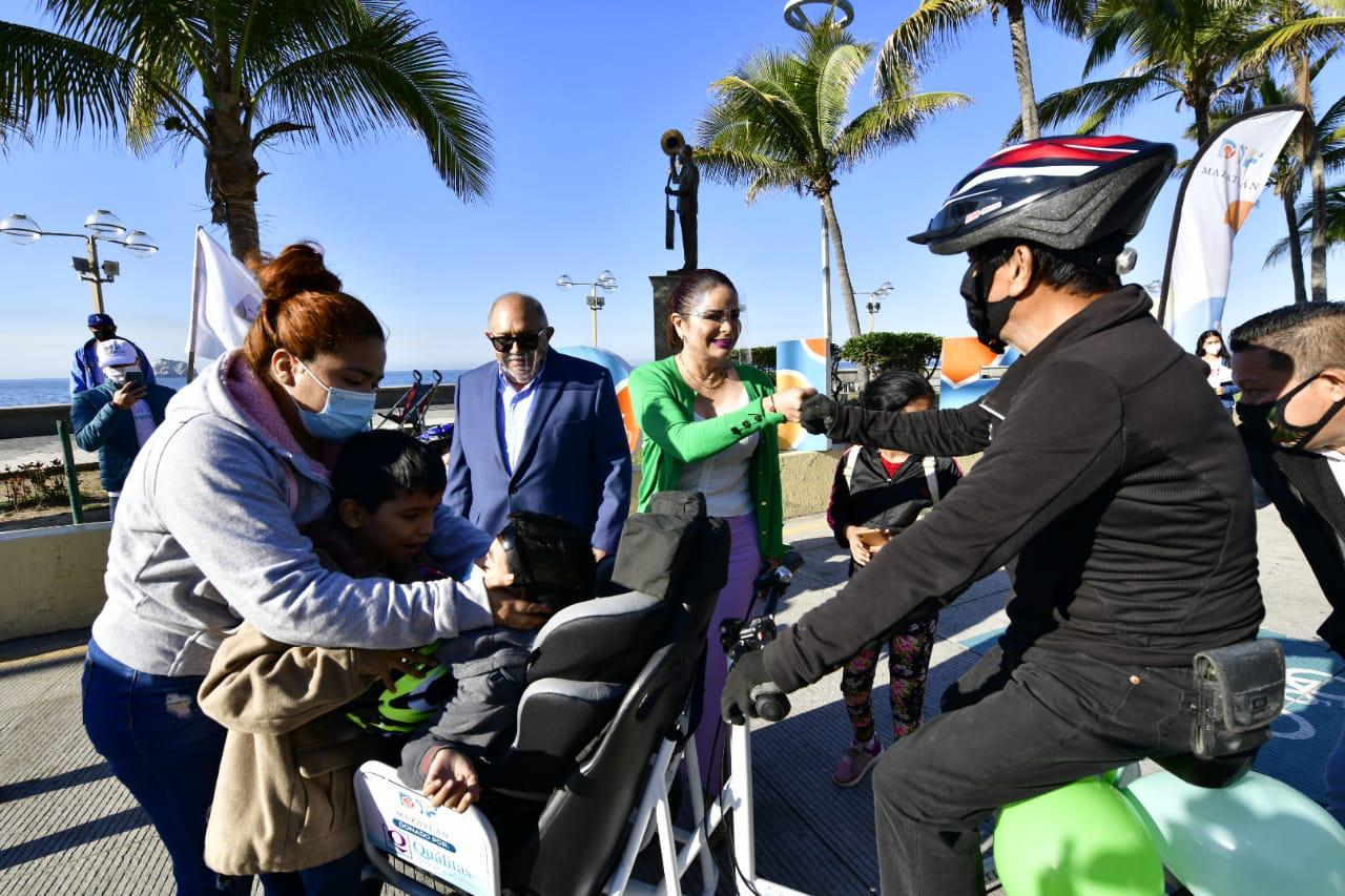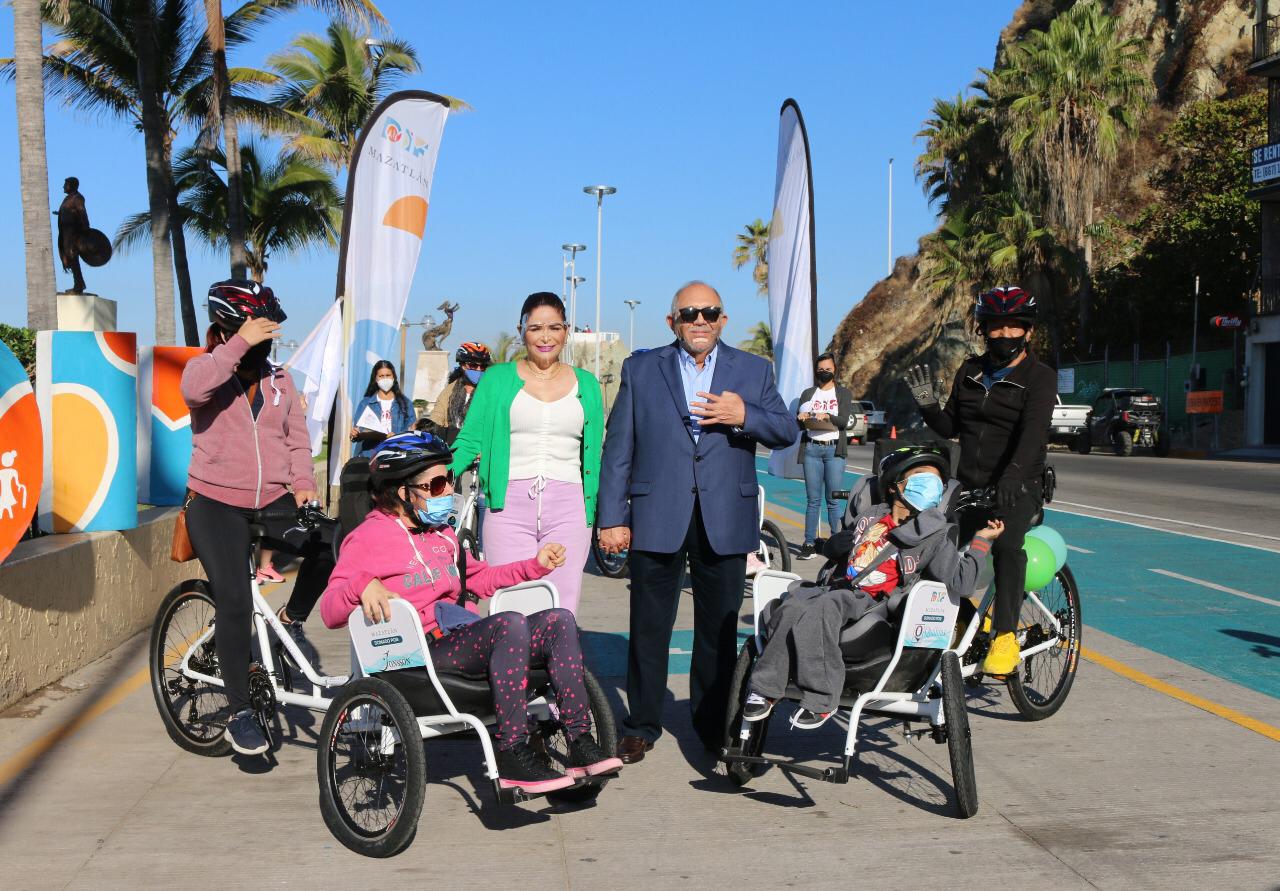Mazatlán.- El Alcalde Luis Guillermo Benitez Torres y su esposa, la señora Gabriela Peña Chico, Presidenta del Sistema DIF Municipal, dieron el banderazo de arranque de paseos gratuitos en tricicletas para personas con discapacidad y adultos mayores sobre la ciclovía del malecón.