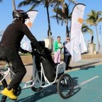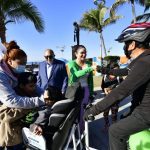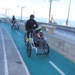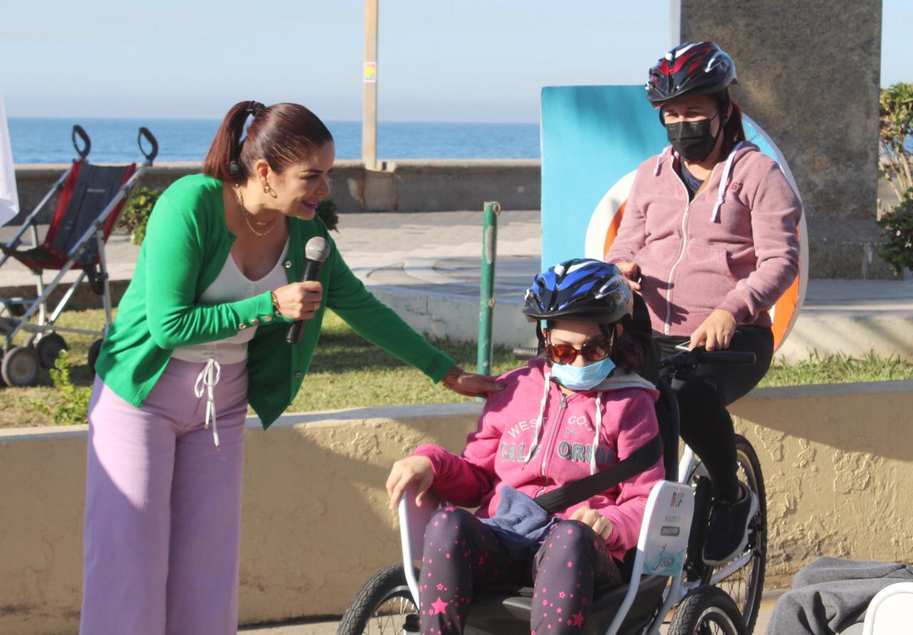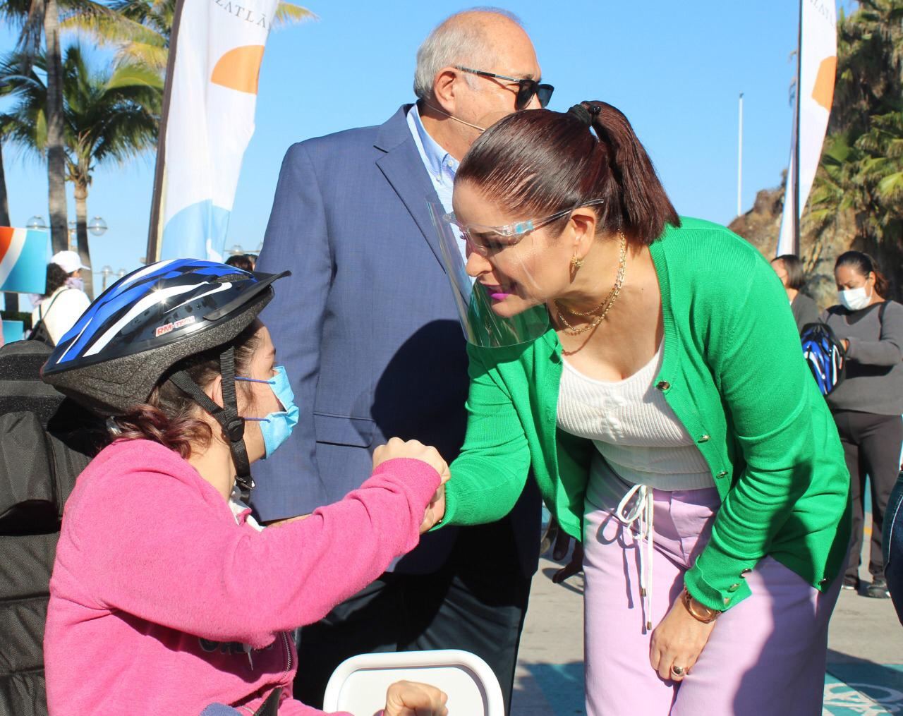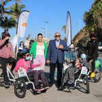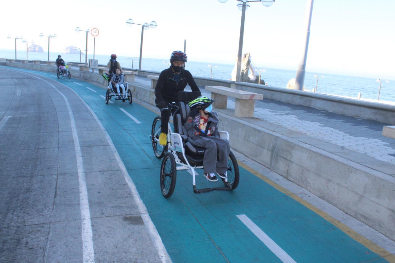 Mazatlán.- El Alcalde Luis Guillermo Benitez Torres y su esposa, la señora Gabriela Peña Chico, Presidenta del Sistema DIF Municipal, dieron el banderazo de arranque de paseos gratuitos en tricicletas para personas con discapacidad y adultos mayores sobre la ciclovía del malecón.