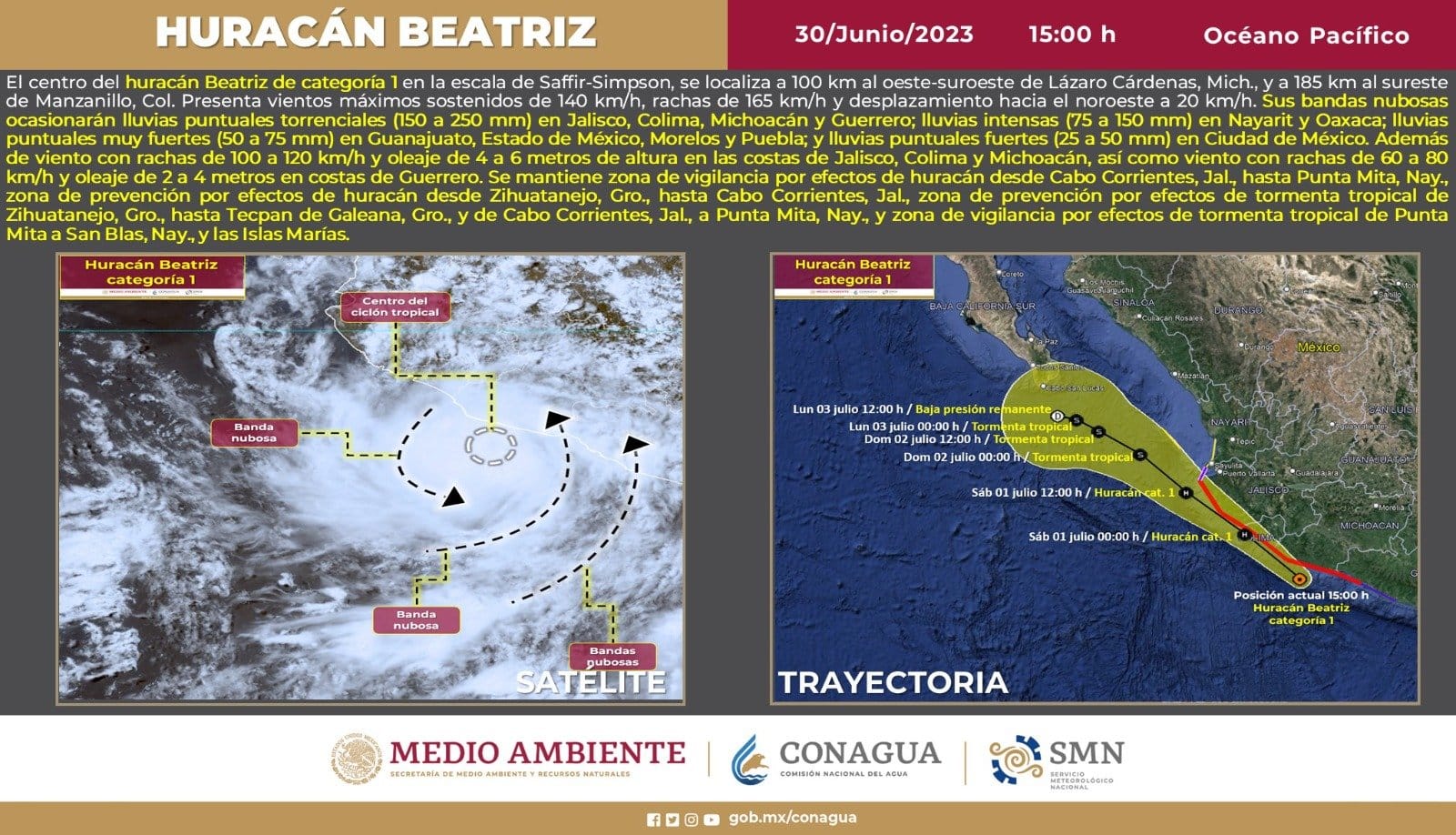 Por otra parte, el titular de Protección Civil Estatal señaló que se está monitoreando tanto la trayectoria como los cambios del huracán Beatriz que se formó en el Océano Pacífico y que de acuerdo al más reciente reporte climatológico efectuado por la Comisión Nacional del Agua, se encuentra cerca de las costas de Jalisco y Colima, por lo que si bien, hasta el momento mantiene su categoría 1, continúa en observación como medida preventiva.