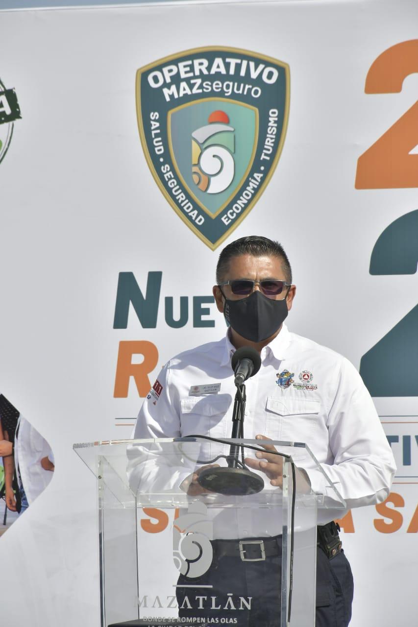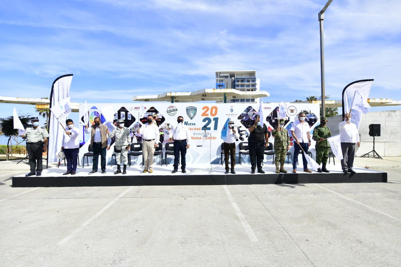 Mazatlán.- El Alcalde José Manuel Villalobos Jiménez, acompañado representantes de los tres niveles de Gobierno, puso en marcha el Operativo Nueva Realidad Semana Santa 2021, para resguardar la seguridad de visitantes y locales durante el próximo periodo vacacional.