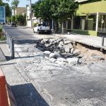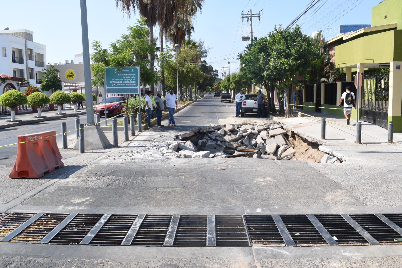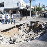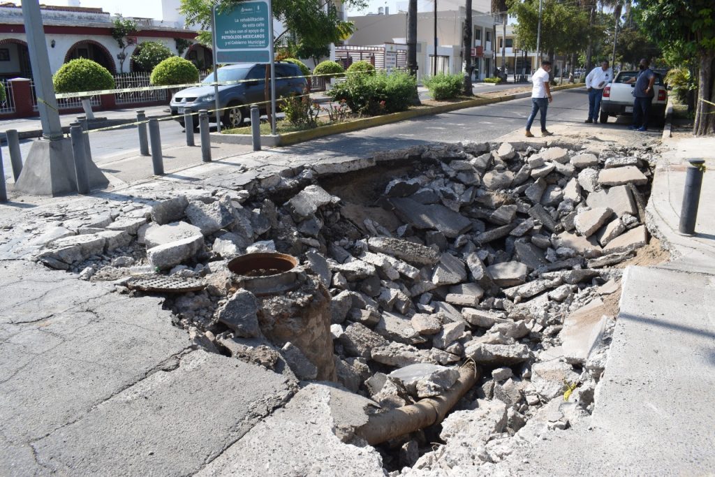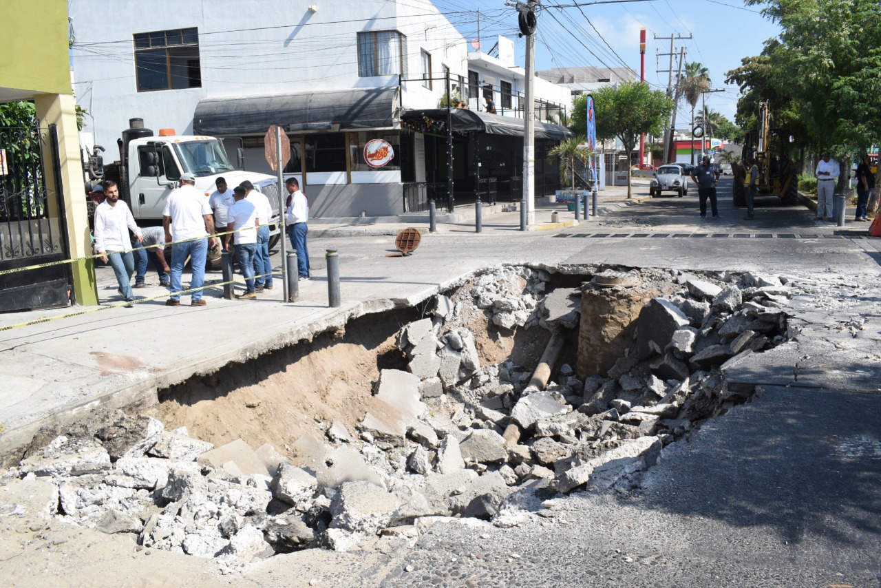 Personal de la Junta Municipal de Agua Potable y Alcantarillado de Mazatlán ya se encuentra trabajando en la zona, cuyo derrame provocó el hundimiento del pavimento y se abrió un socavón que mide más de dos metros de profundidad y cuatro de longitud.