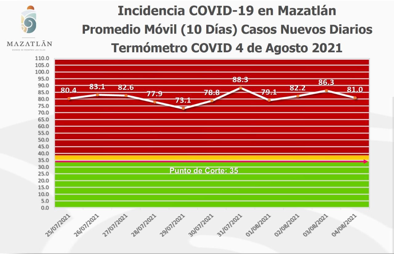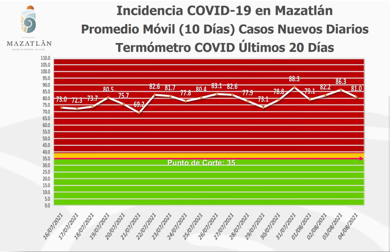 Agregó que el Termómetro Covid del Ayuntamiento se ubicó en los 81.0 grados y se mantiene en color rojo.