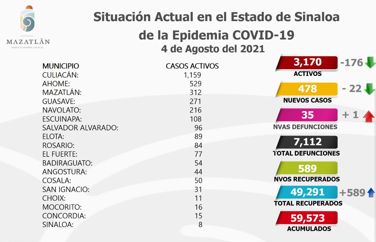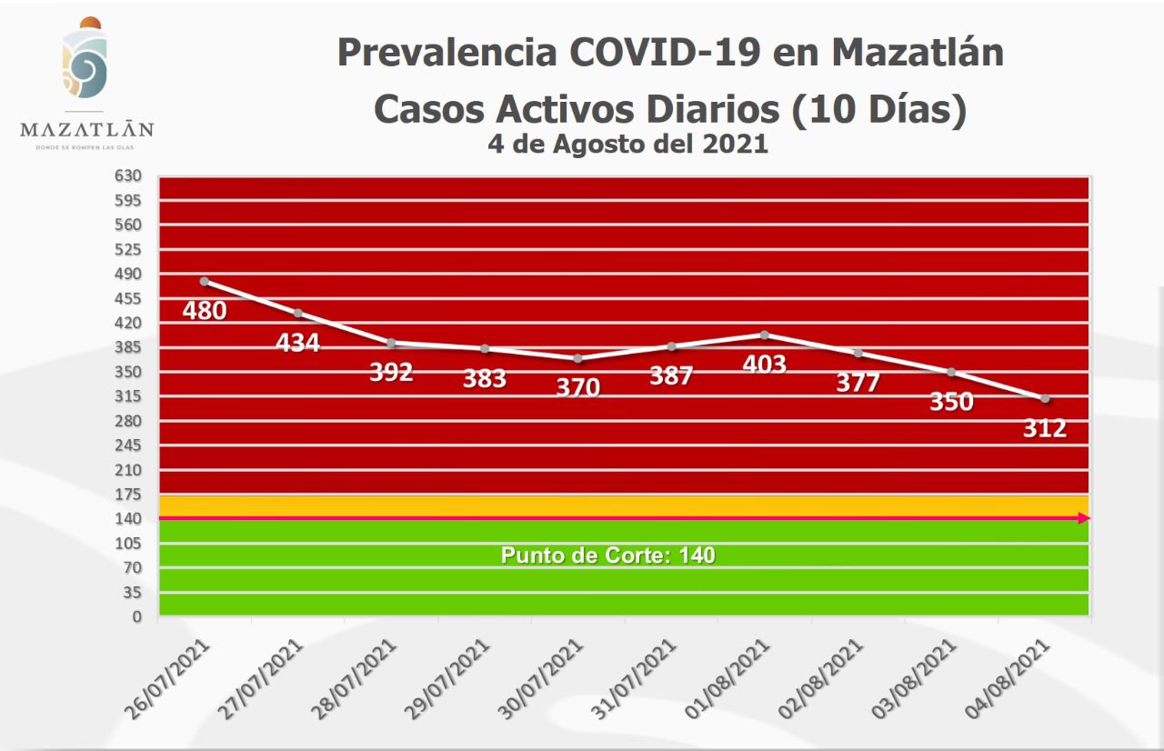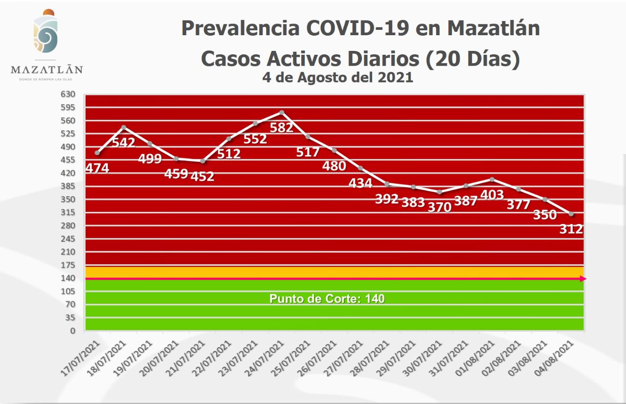 Mazatlán.- Por tercer día consecutivo, el puerto presenta una tendencia favorable a la baja en casos activos de Covid-19, y este jueves tiene 312 pacientes del virus Sars-Cov-2, informó Cristian Castillo López, encargado de Protocolos y Sanidad en el Gobierno Municipal.