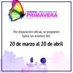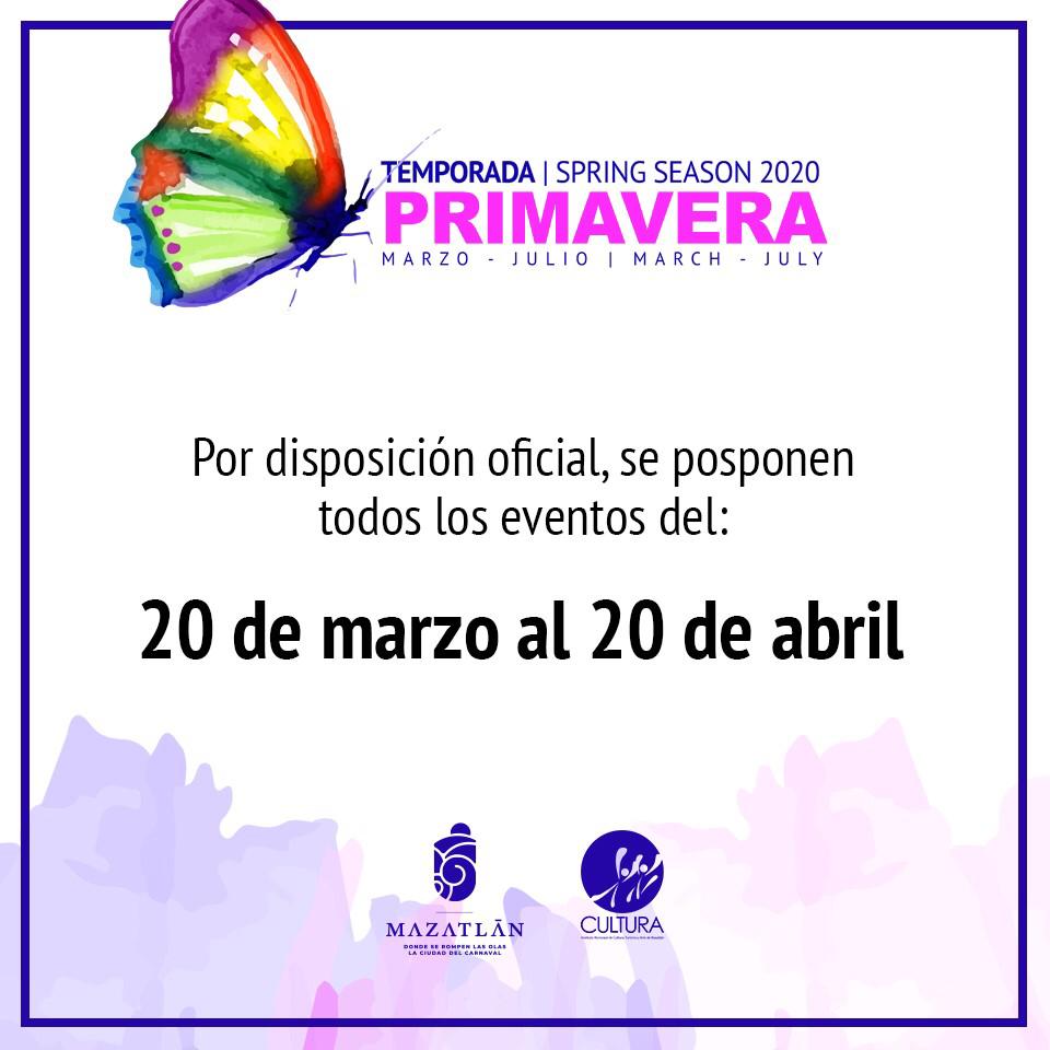 Mazatlán, Sinaloa, 17 de marzo de 2020.- Como medida preventiva para evitar algún posible contagio de coronavirus en el Puerto de Mazatlán, el Instituto Municipal de Cultura, Turismo y Arte pospone todas las actividades relacionadas al calendario de la Temporada Primavera 2020, mismo que inicia el viernes 20 de marzo, reanudando las actividades el 20 de abril.