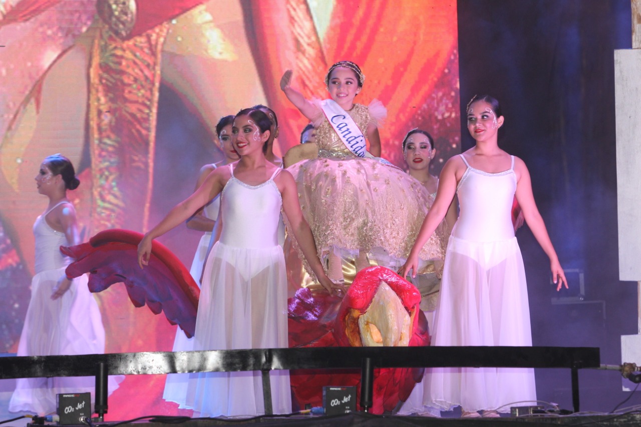 Montadas en dos grandes pájaros y acompañadas por los bailarines, llegaron al escenario las pequeñas Dania Zataráin y Estrella Íñiguez, quienes buscarán la corona de Reina Infantil.